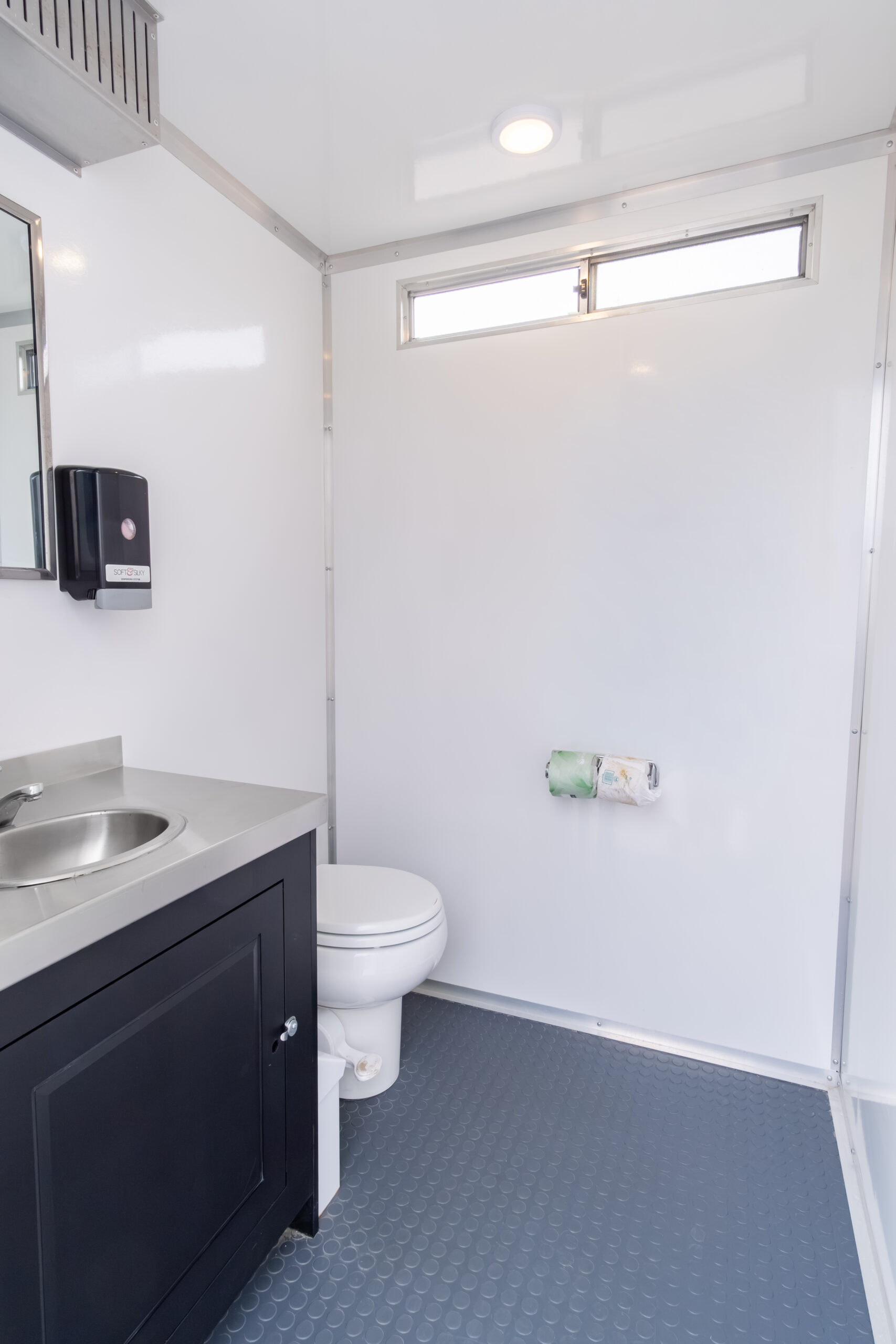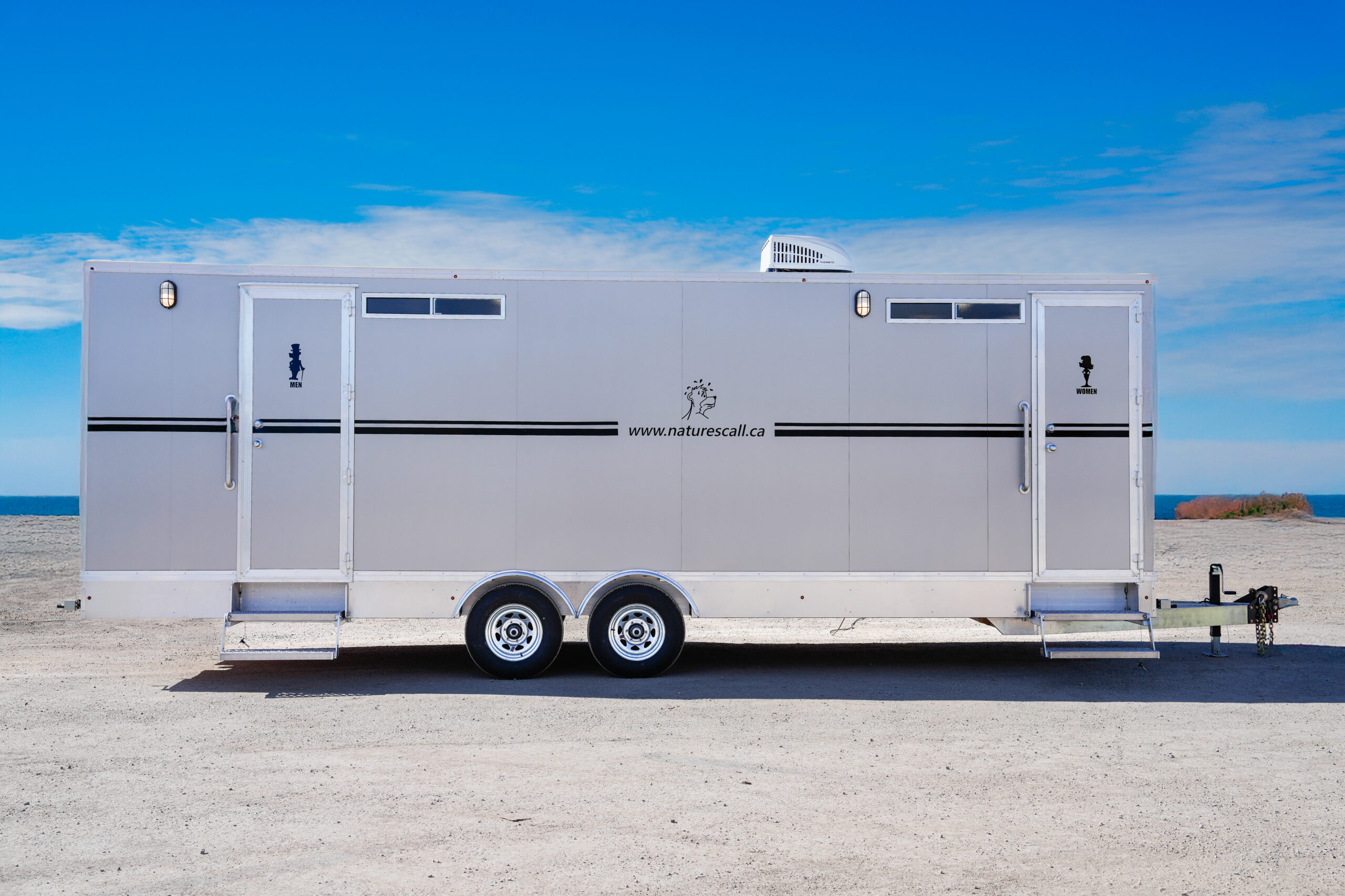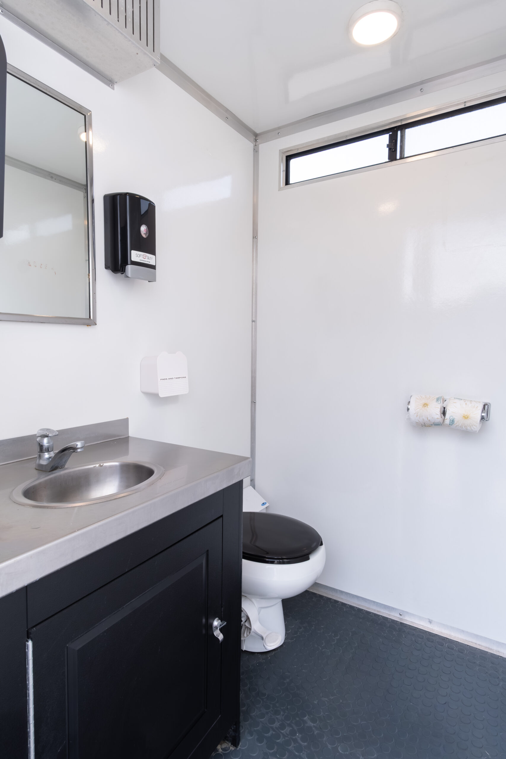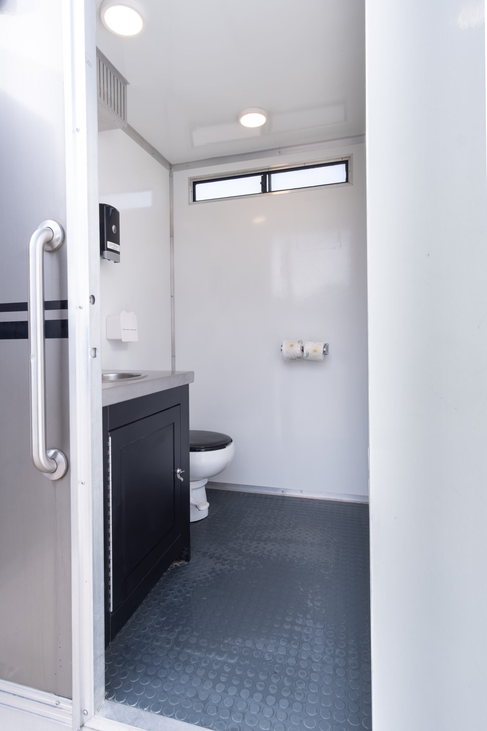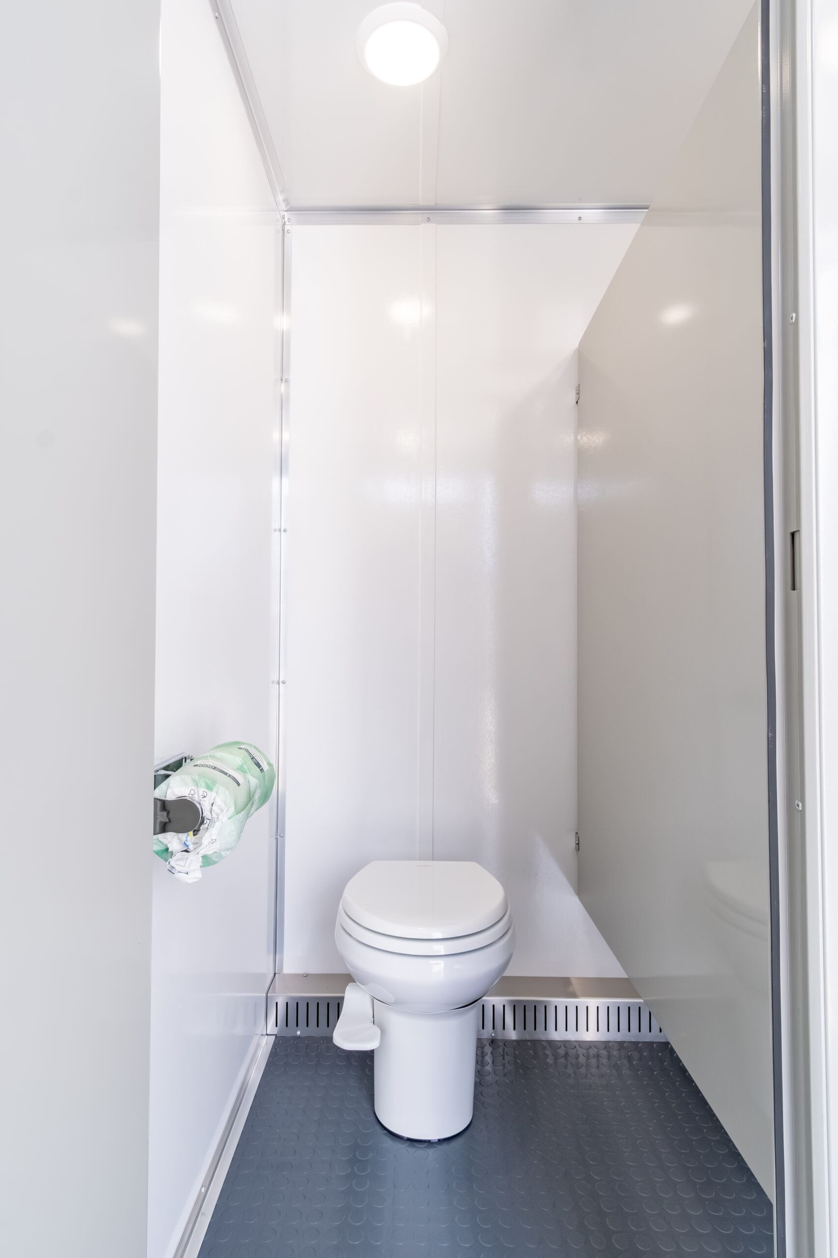 Compact trailer unit that provides on-site restroom capacity in a smaller footprint. Includes air conditioning.