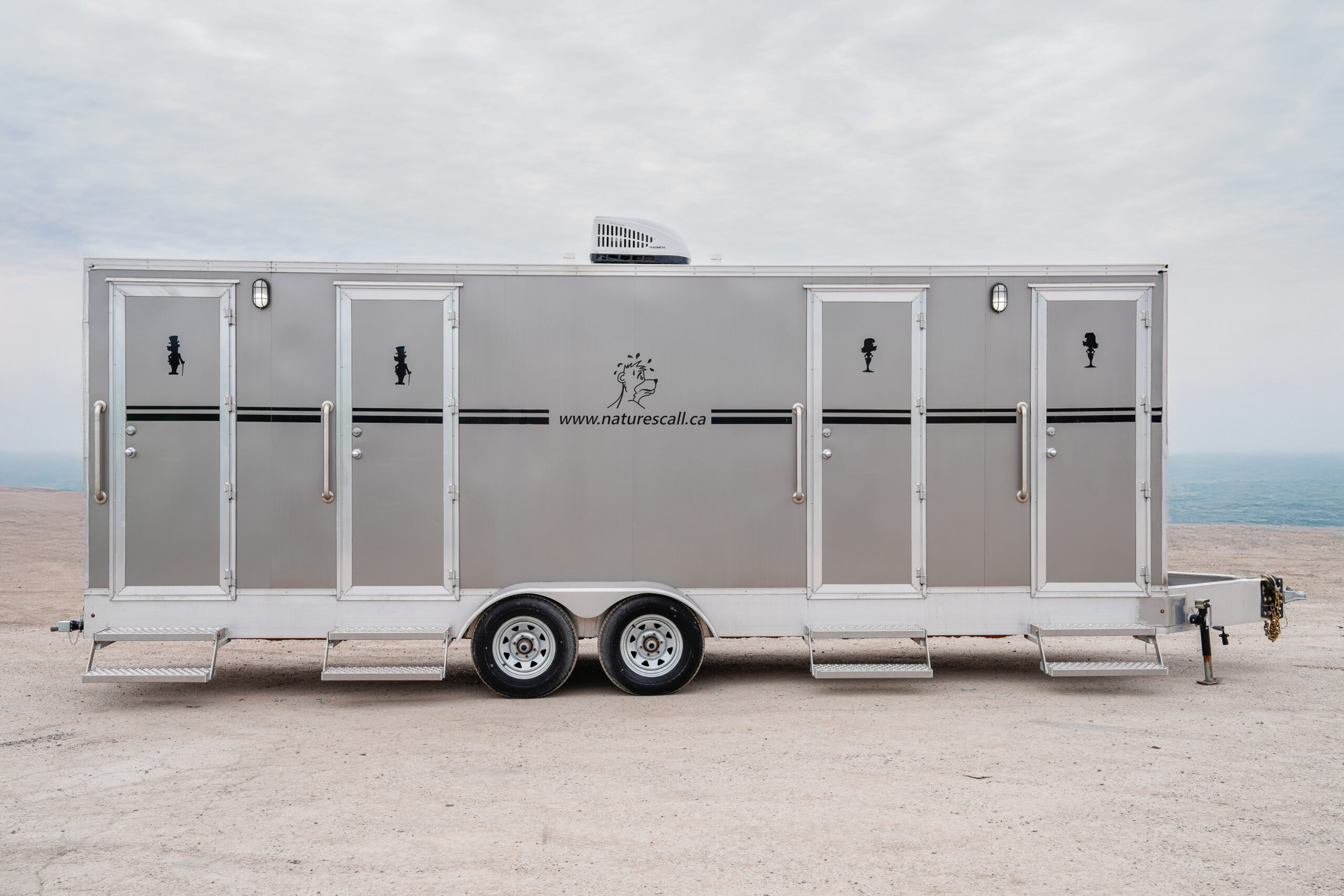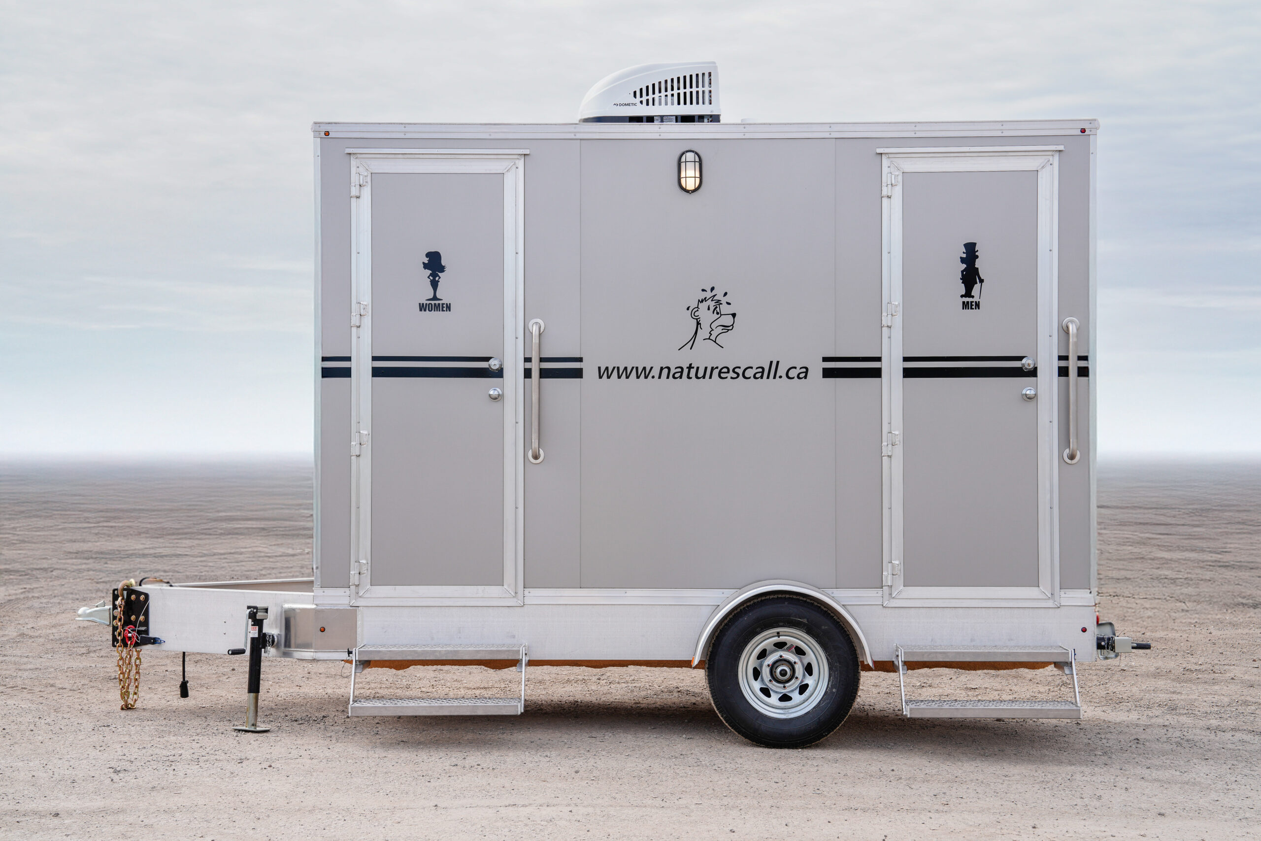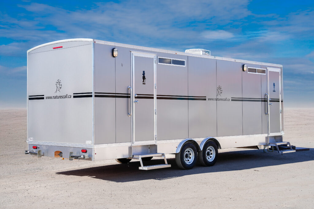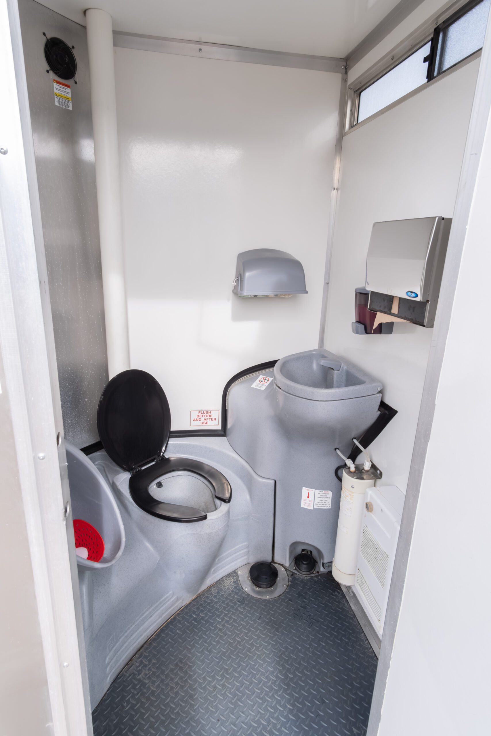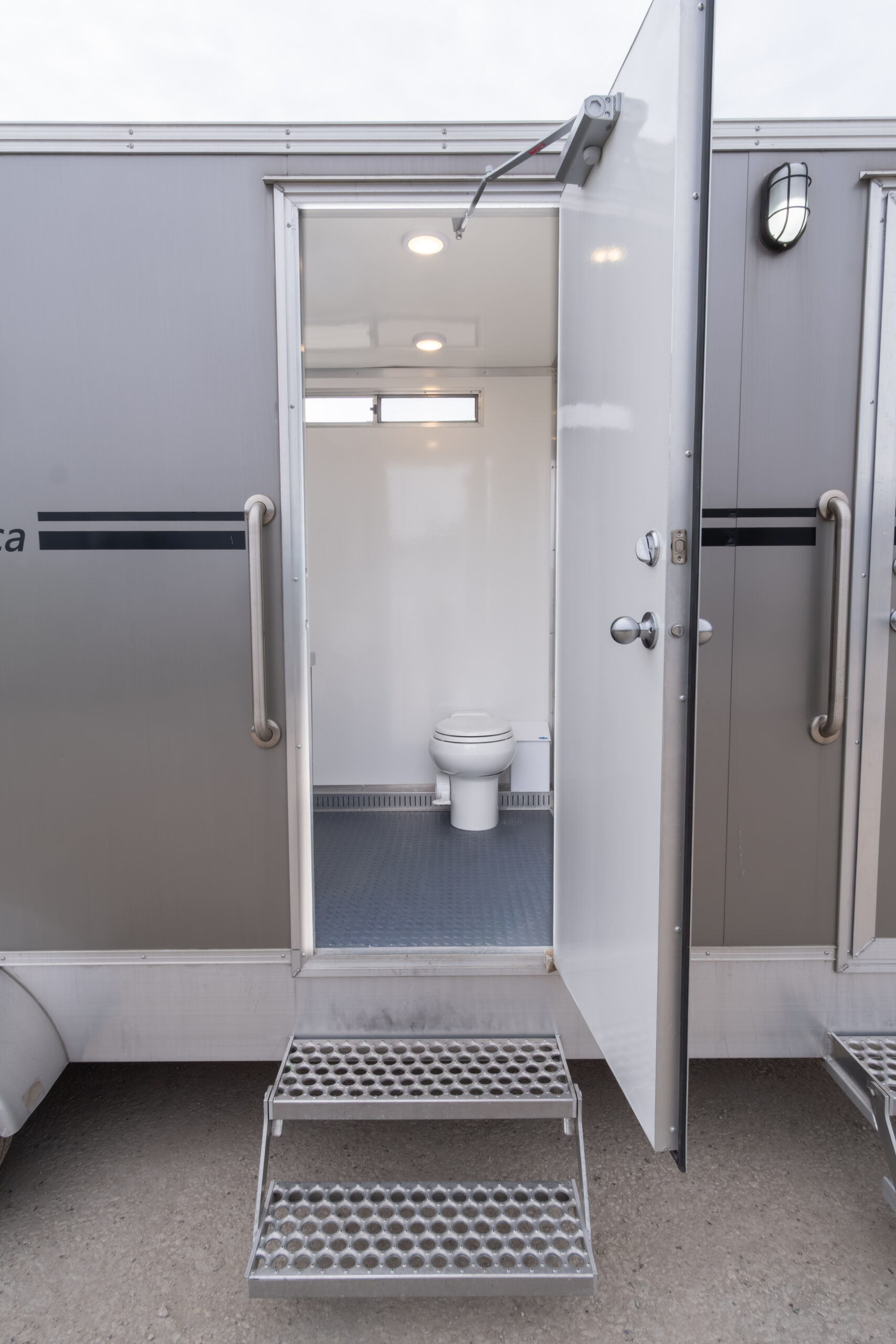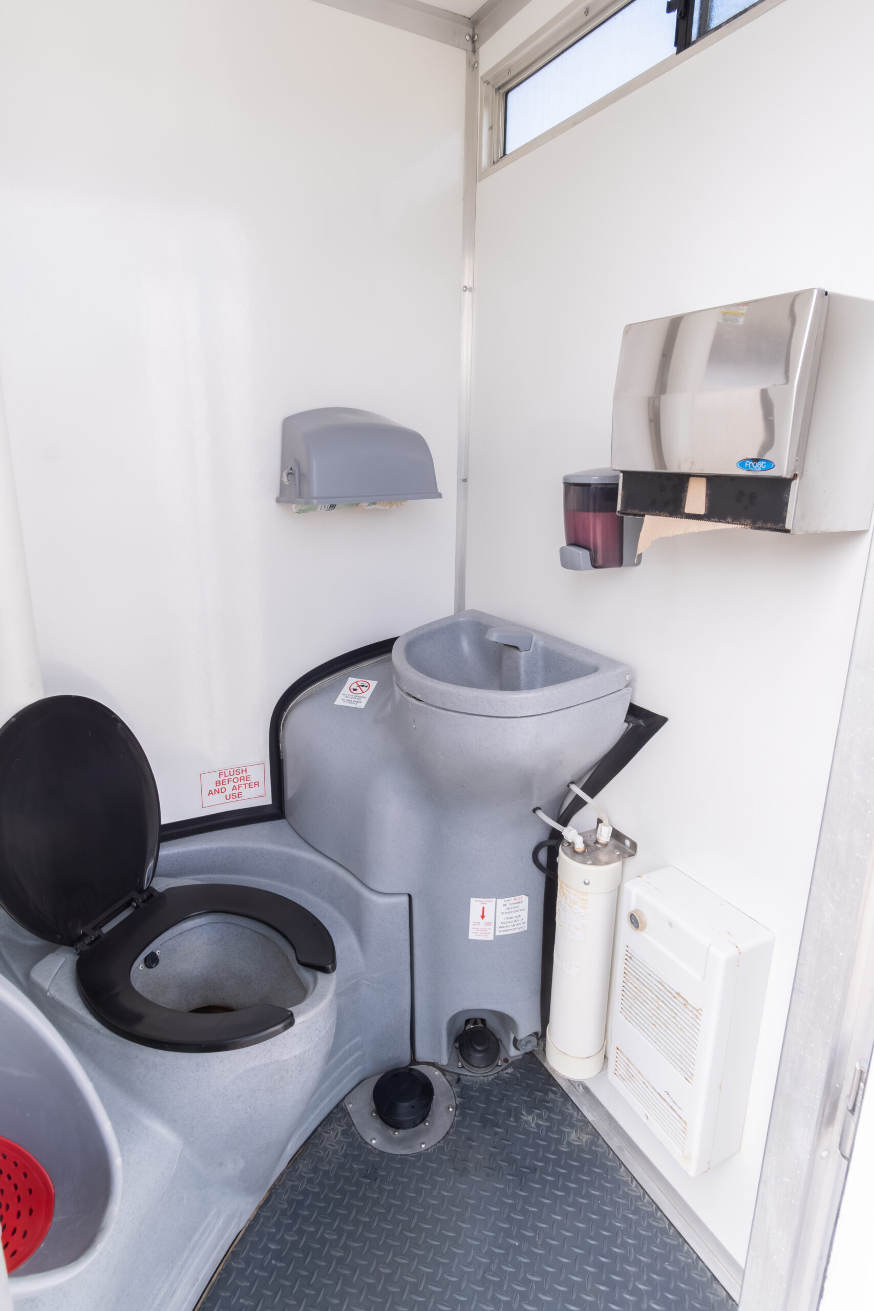 Compact trailer unit that provides on-site restroom capacity in a smaller footprint. Includes air conditioning.
