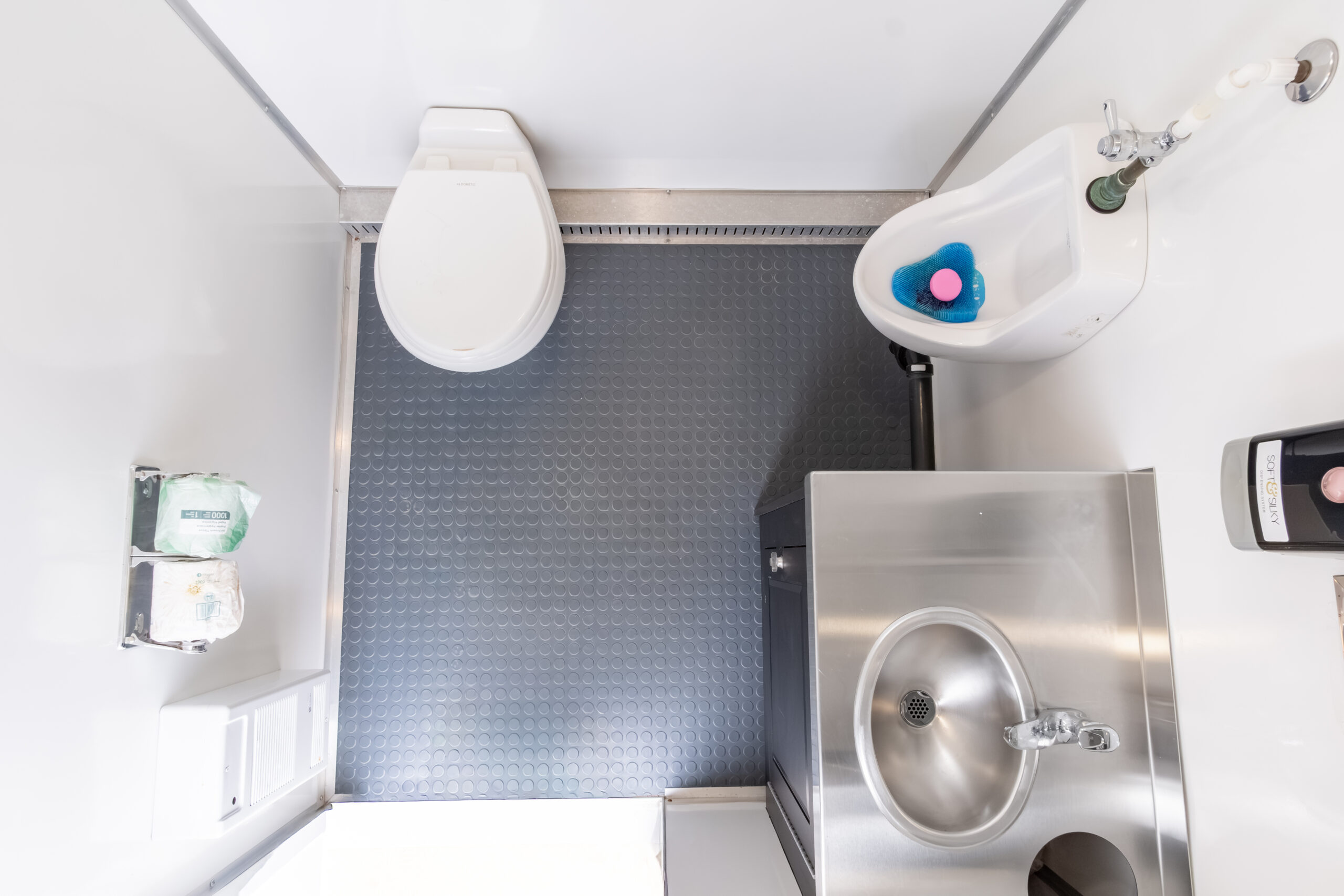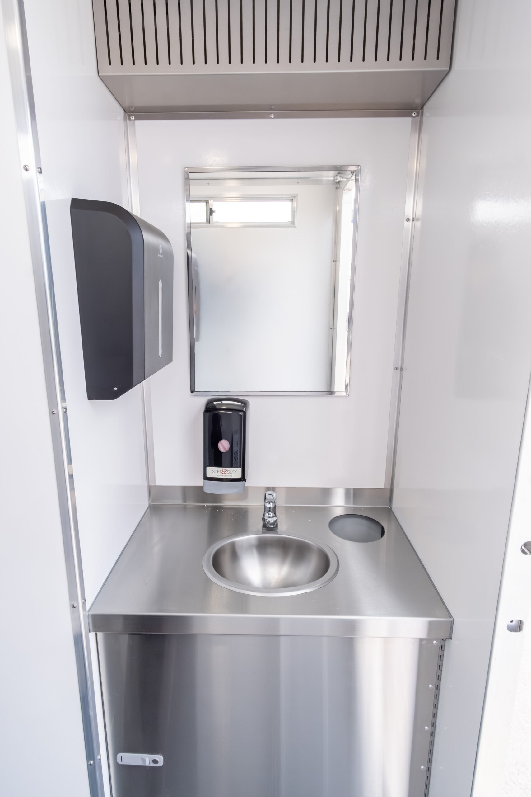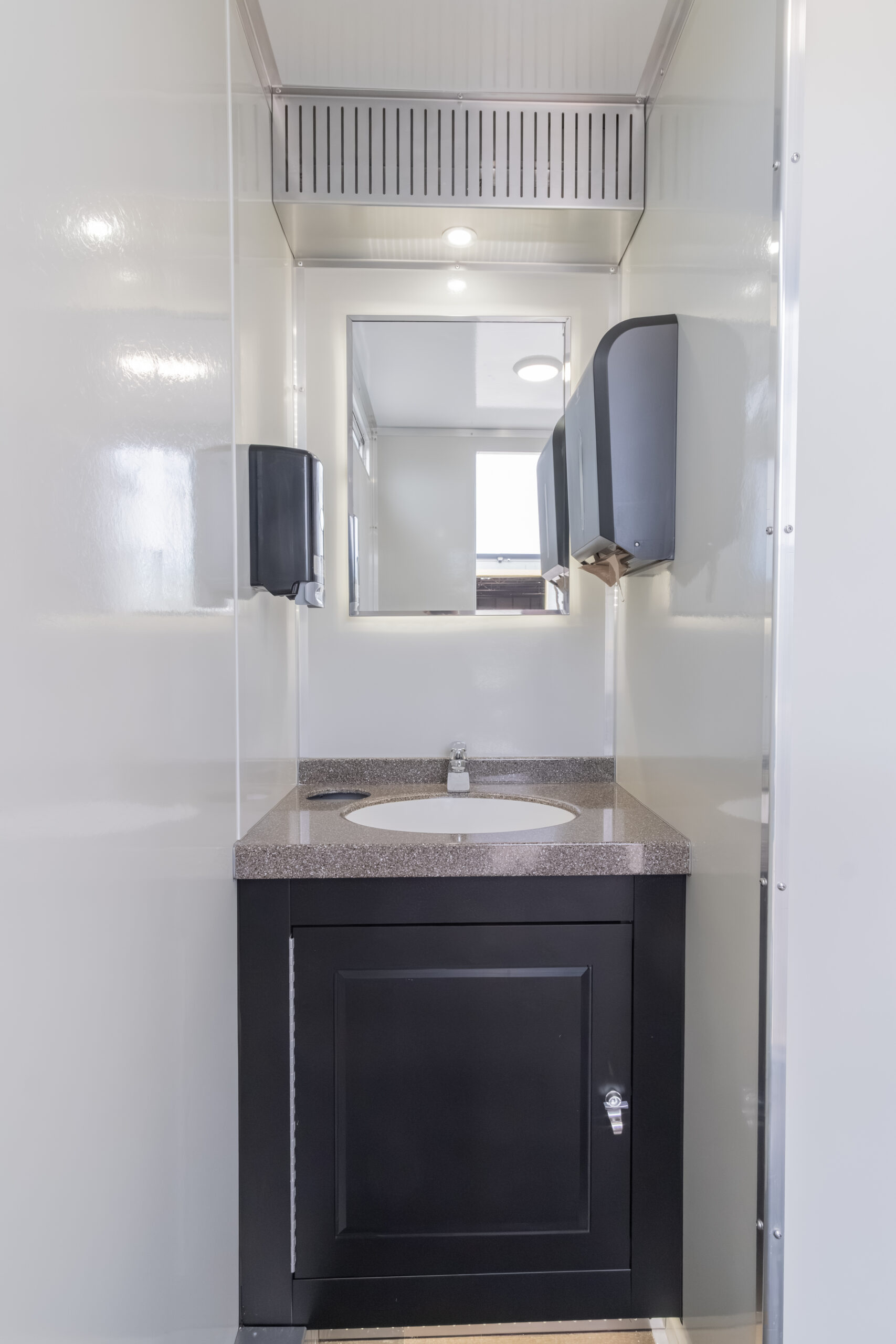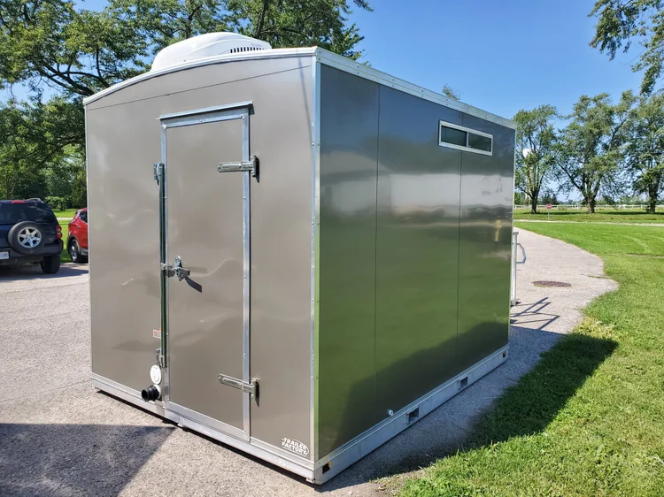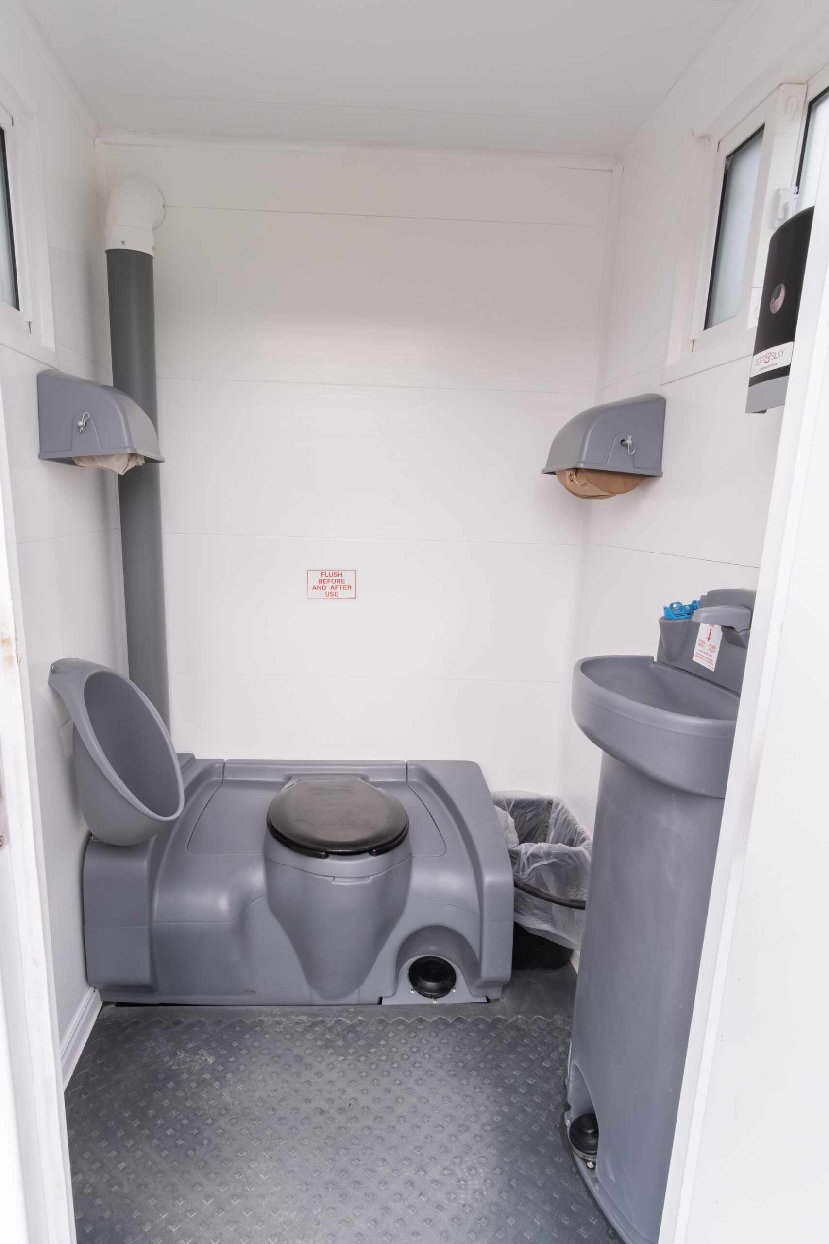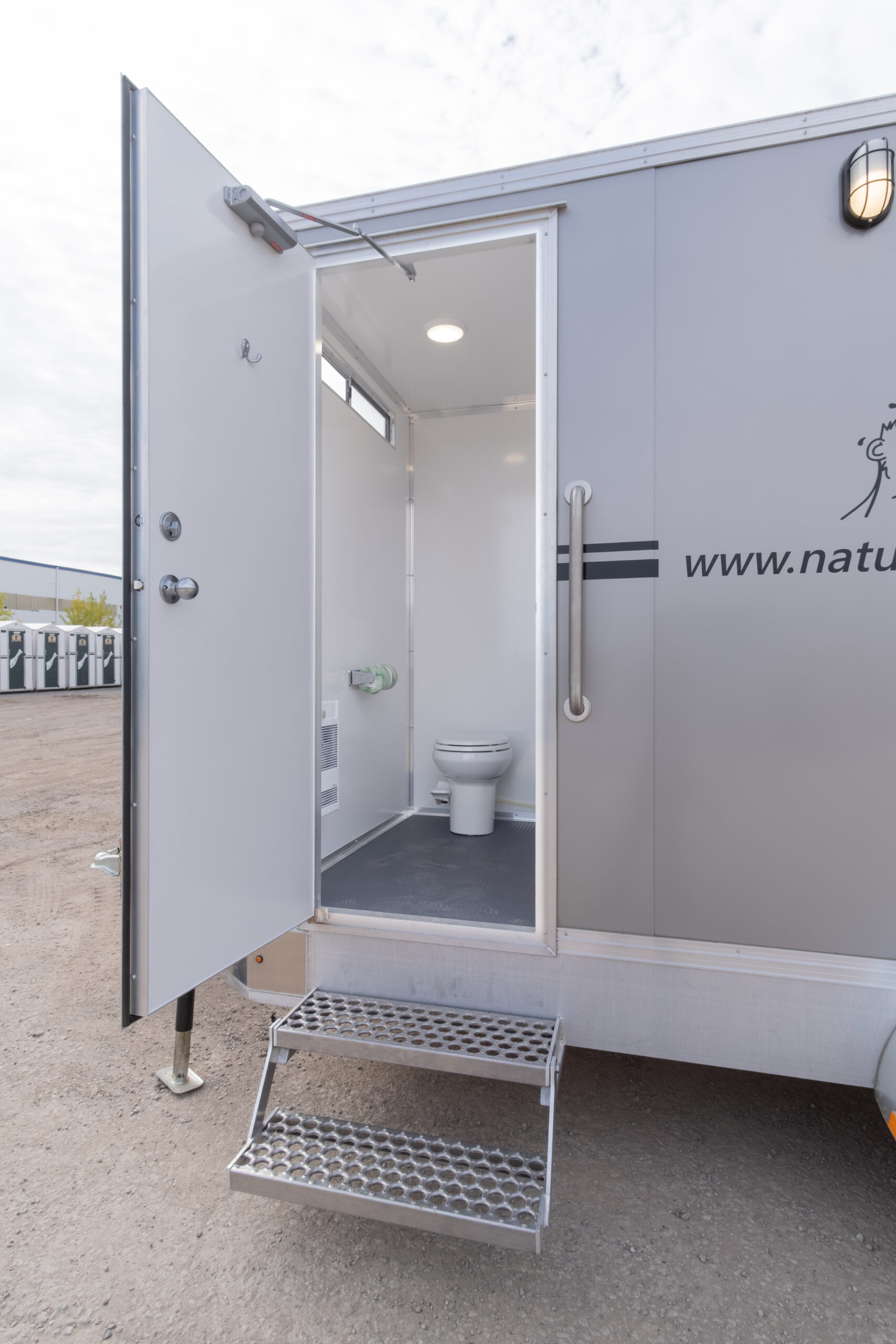 Compact trailer unit that provides on-site restroom capacity in a smaller footprint. Includes air conditioning.
