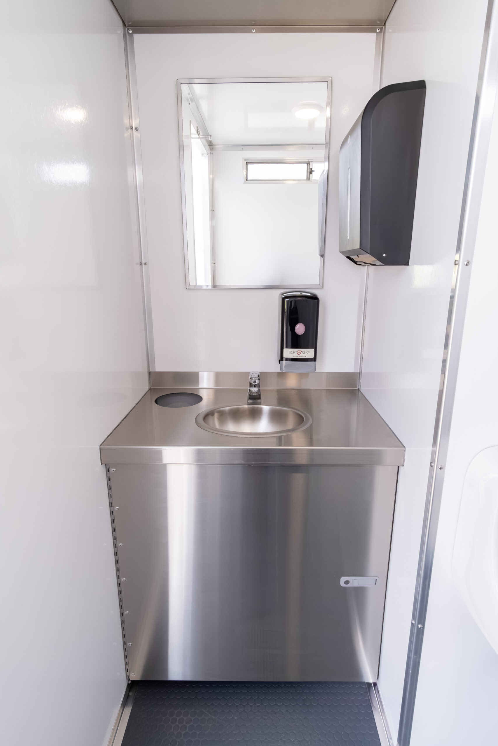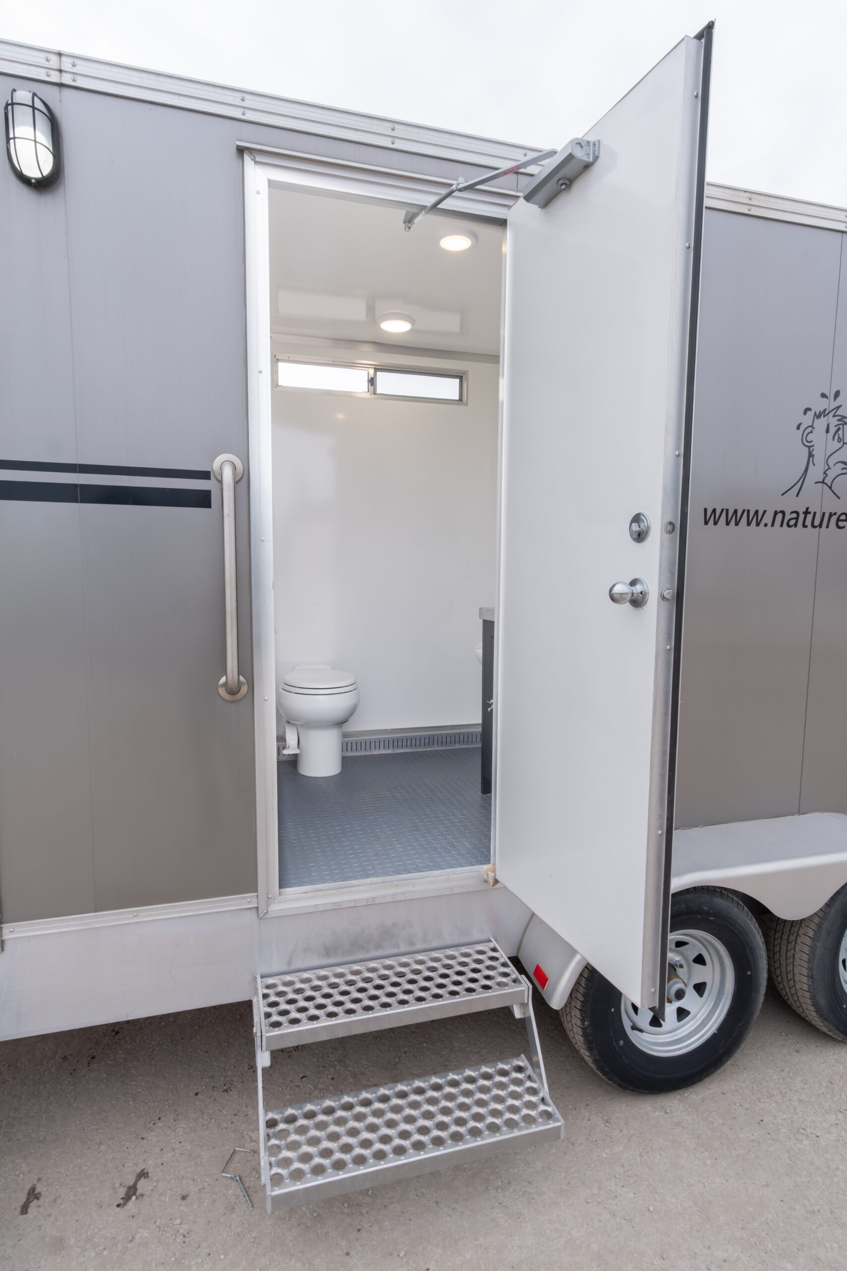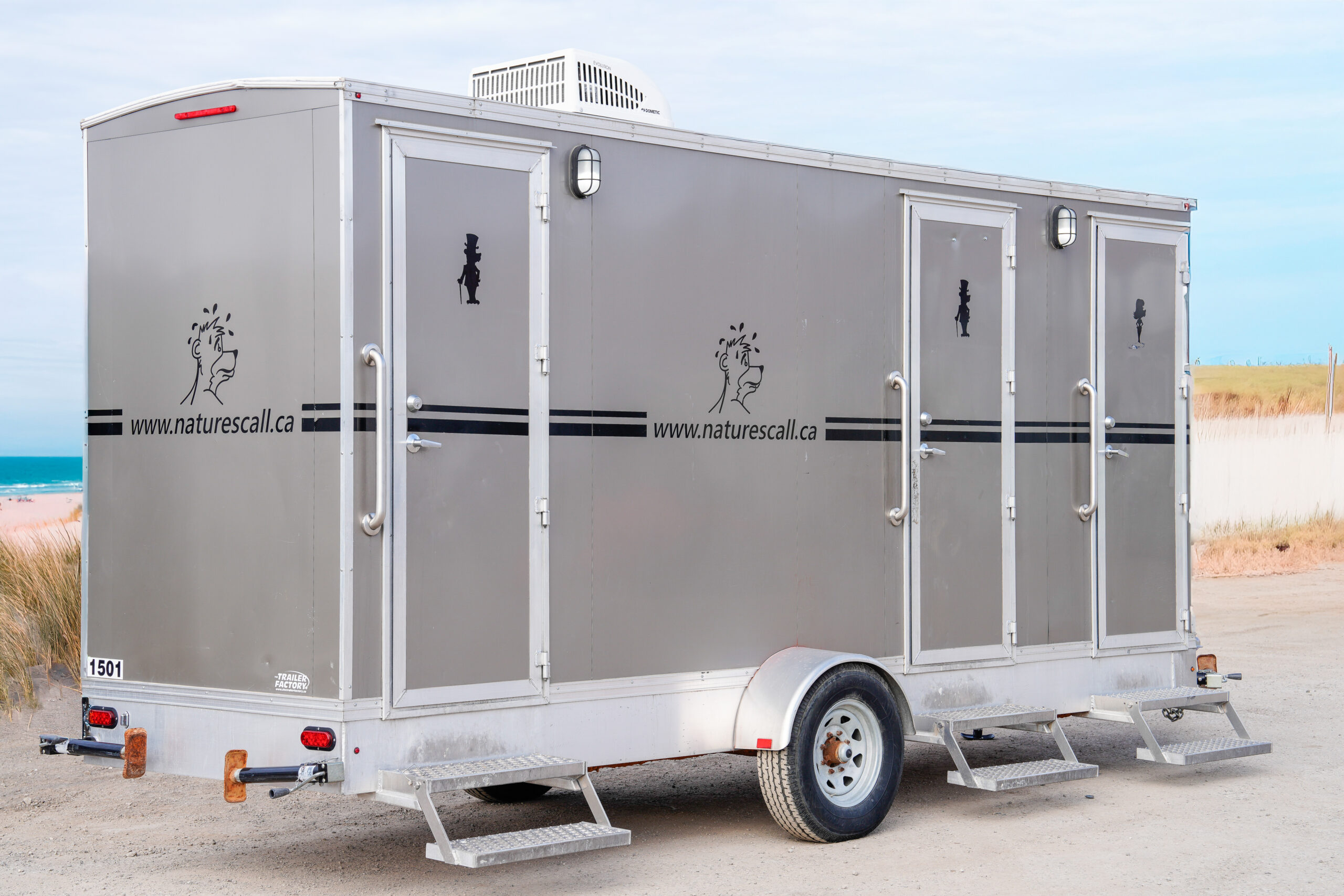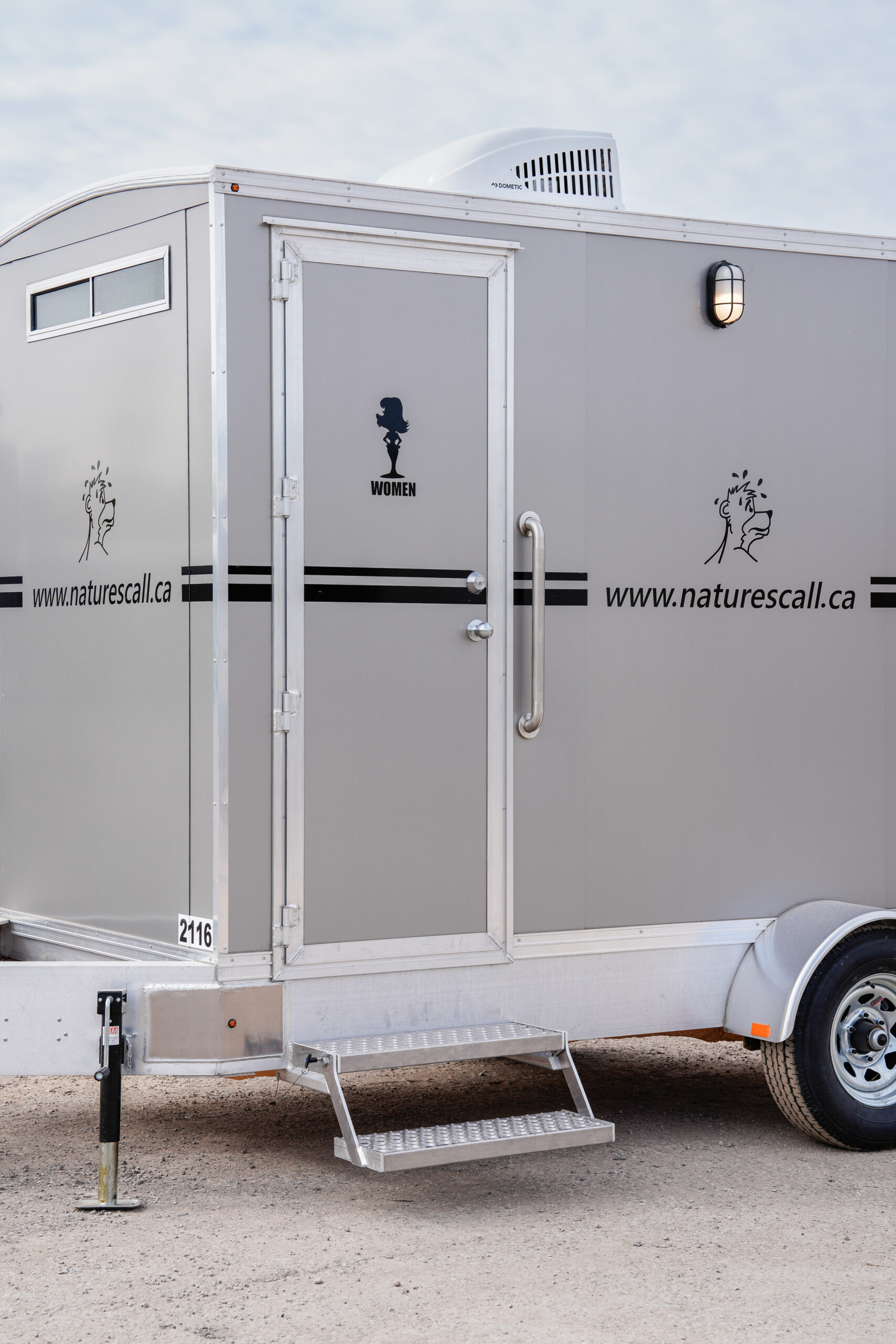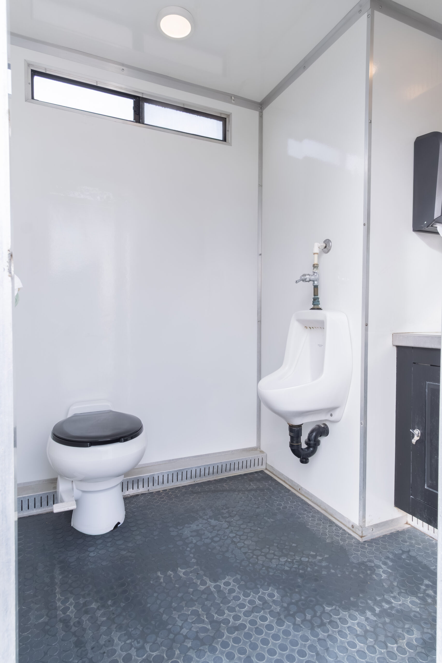 Compact trailer unit that provides on-site restroom capacity in a smaller footprint. Includes air conditioning.