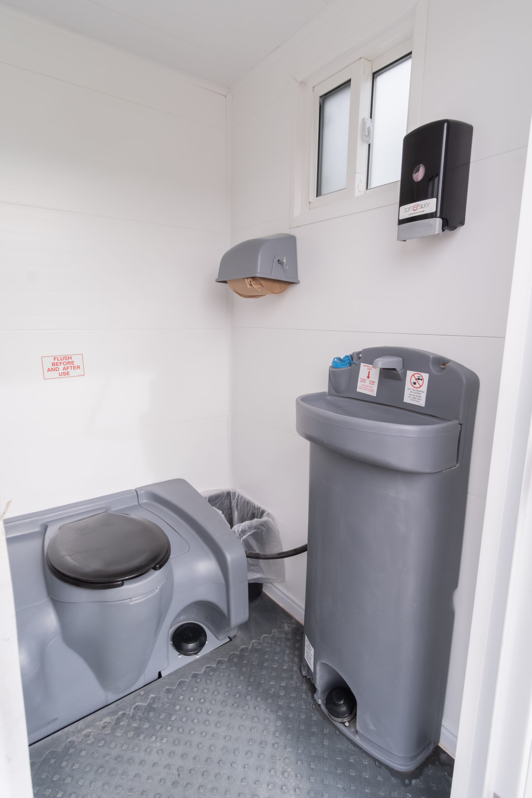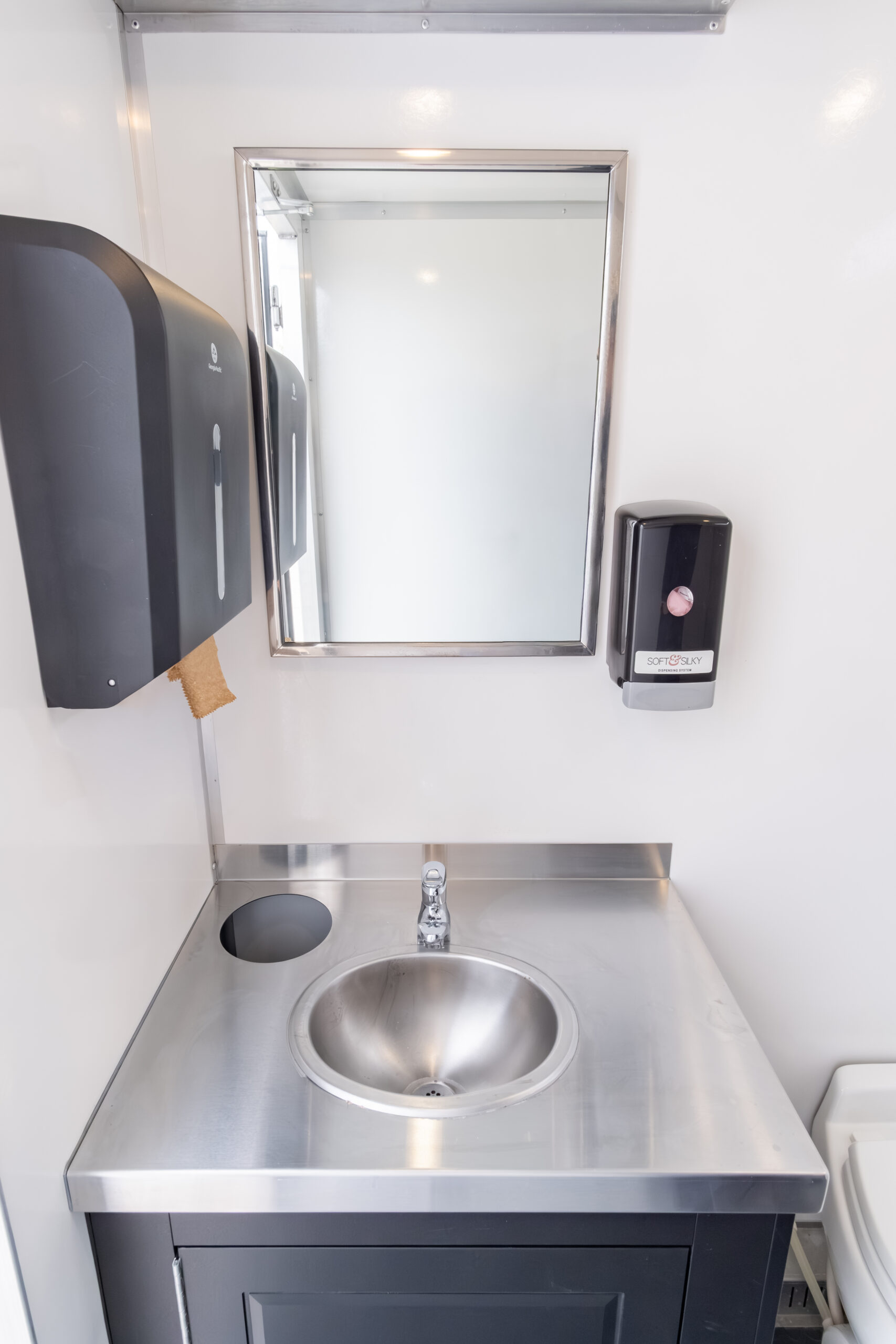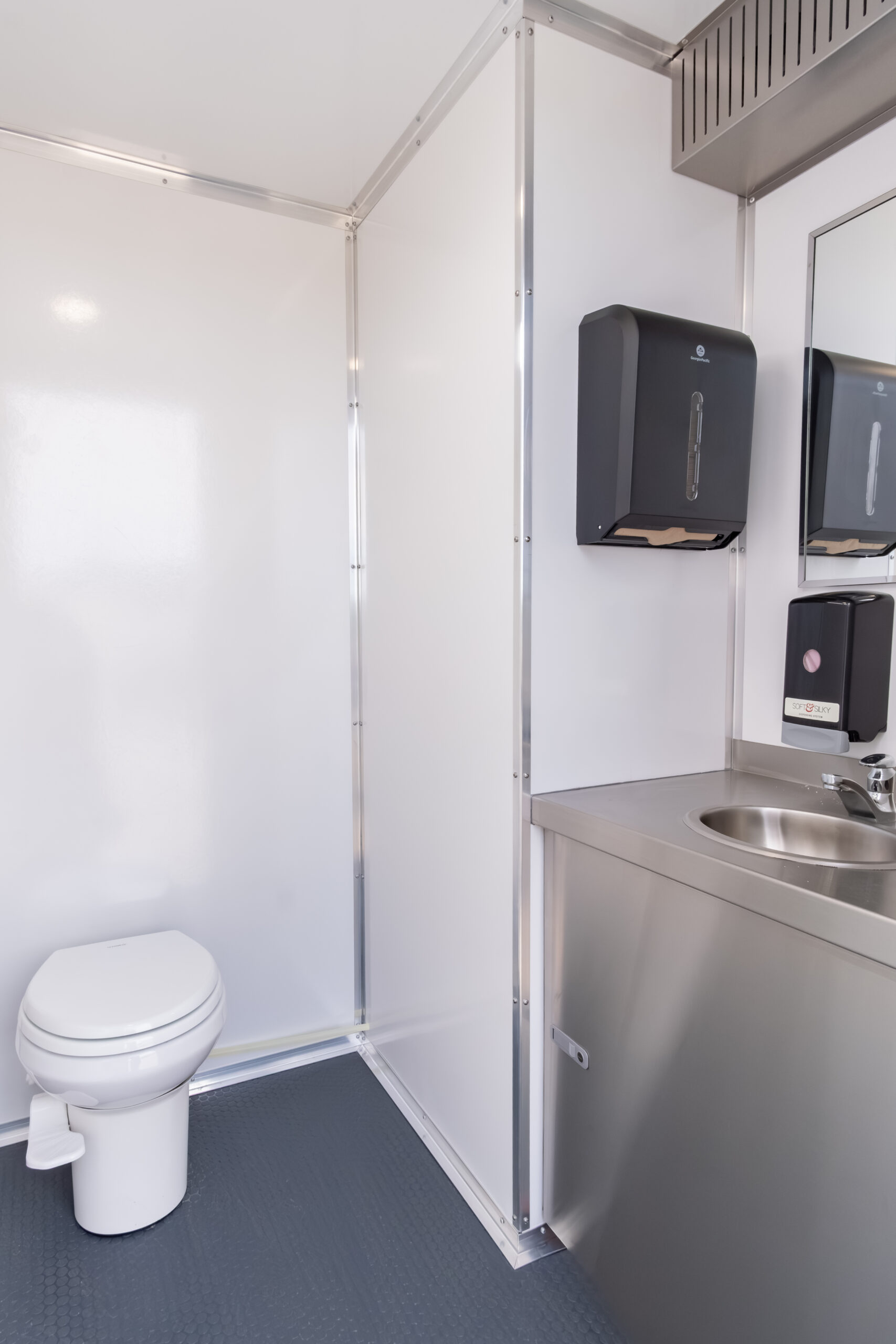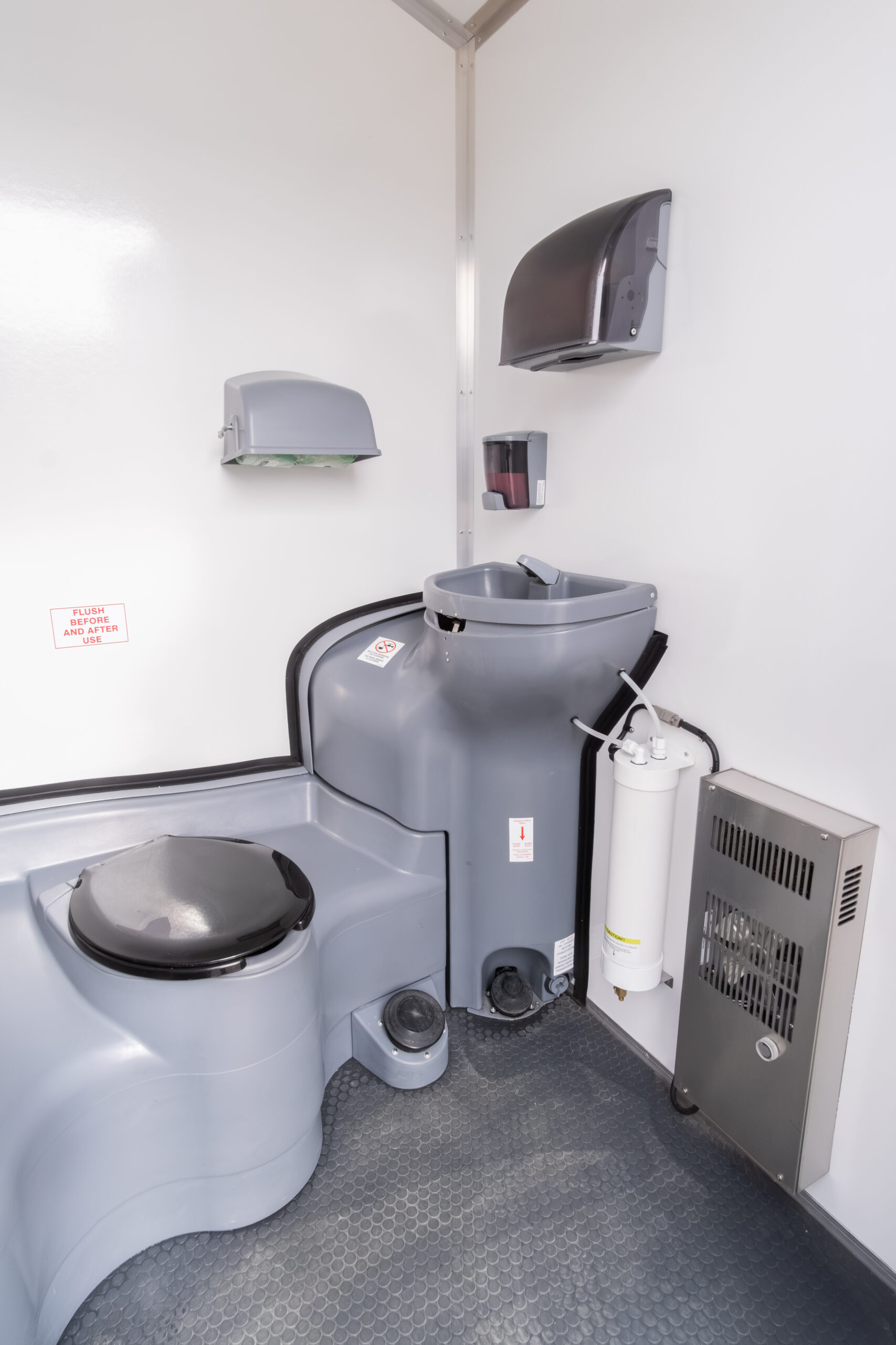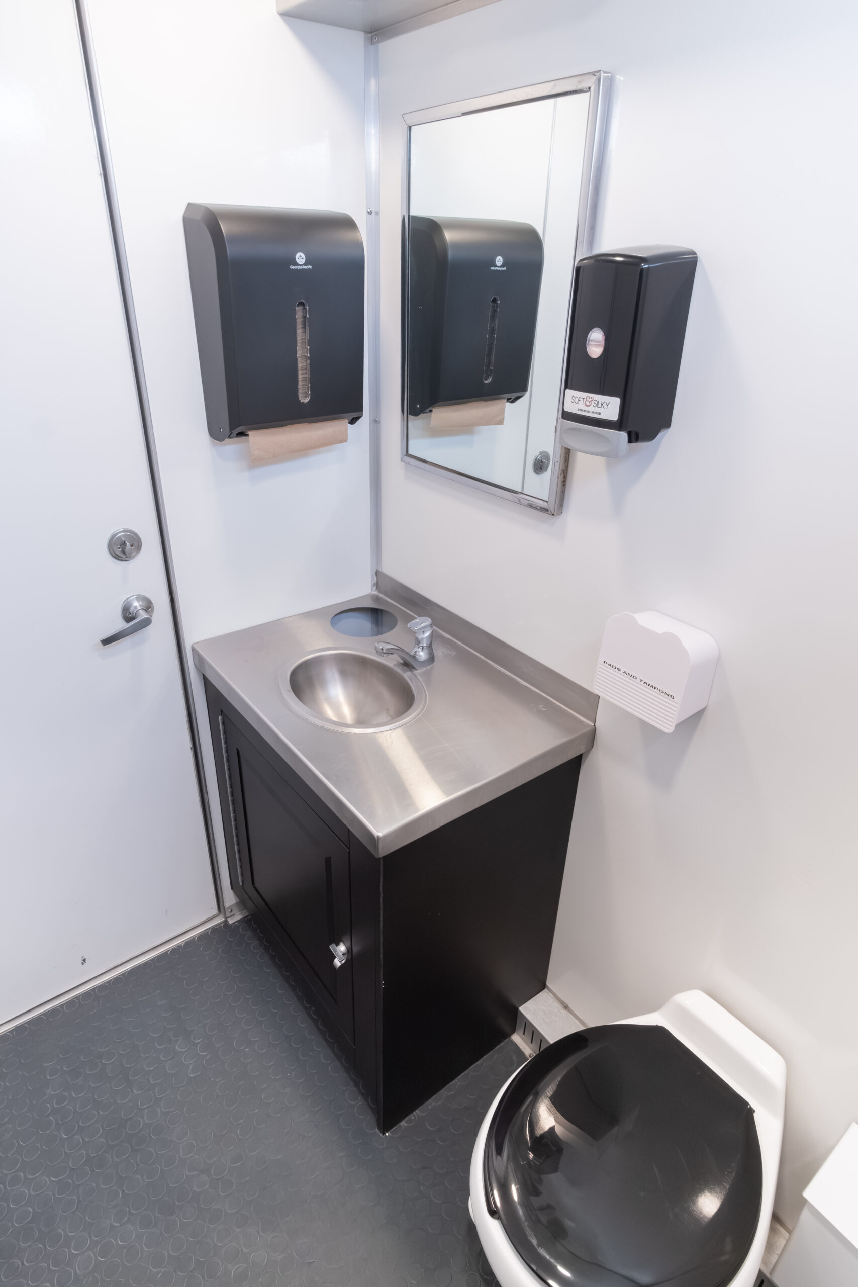 Compact trailer unit that provides on-site restroom capacity in a smaller footprint. Includes air conditioning.
