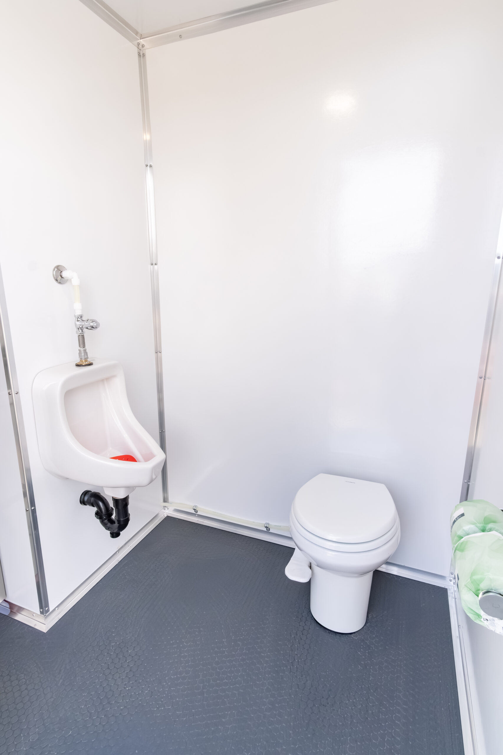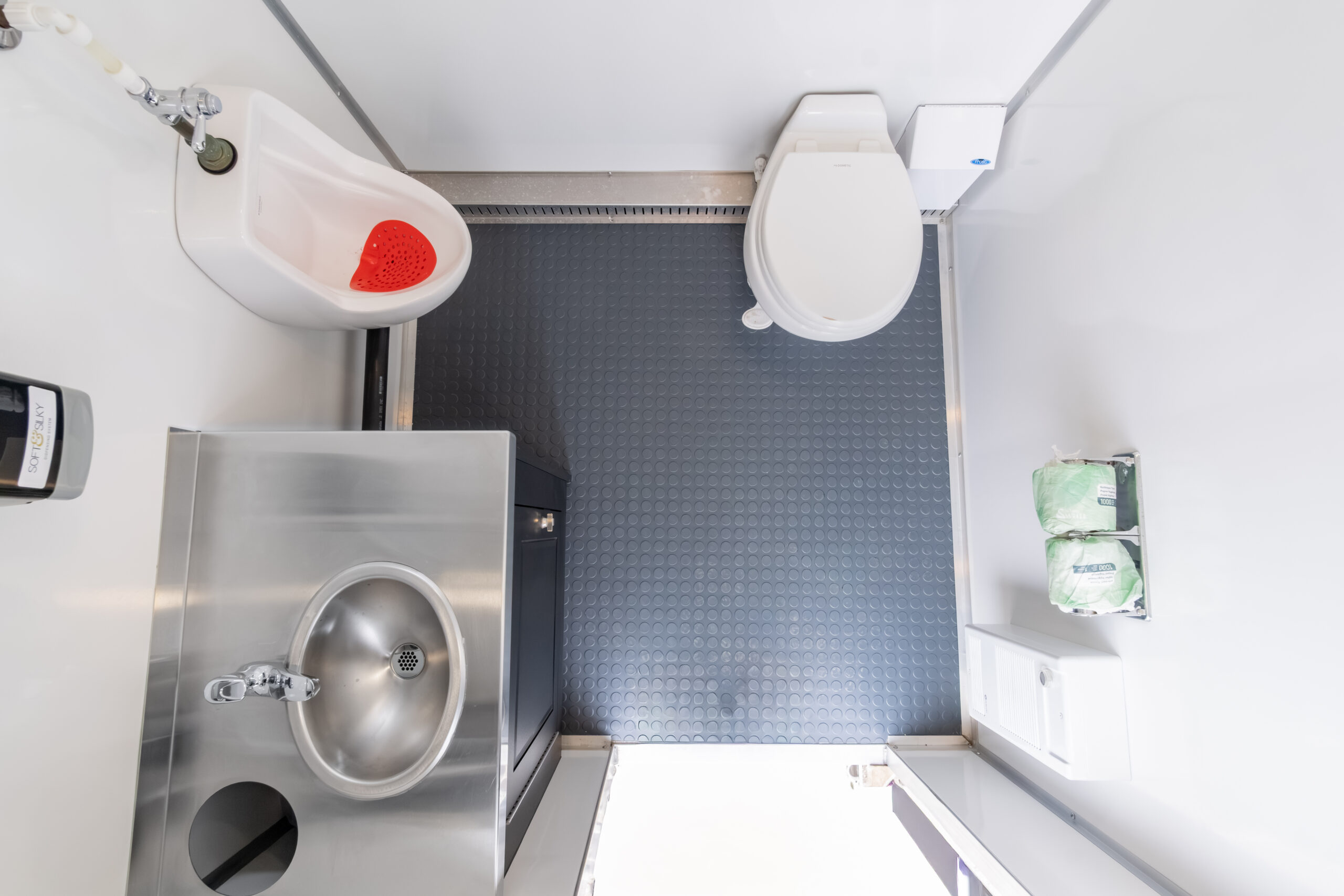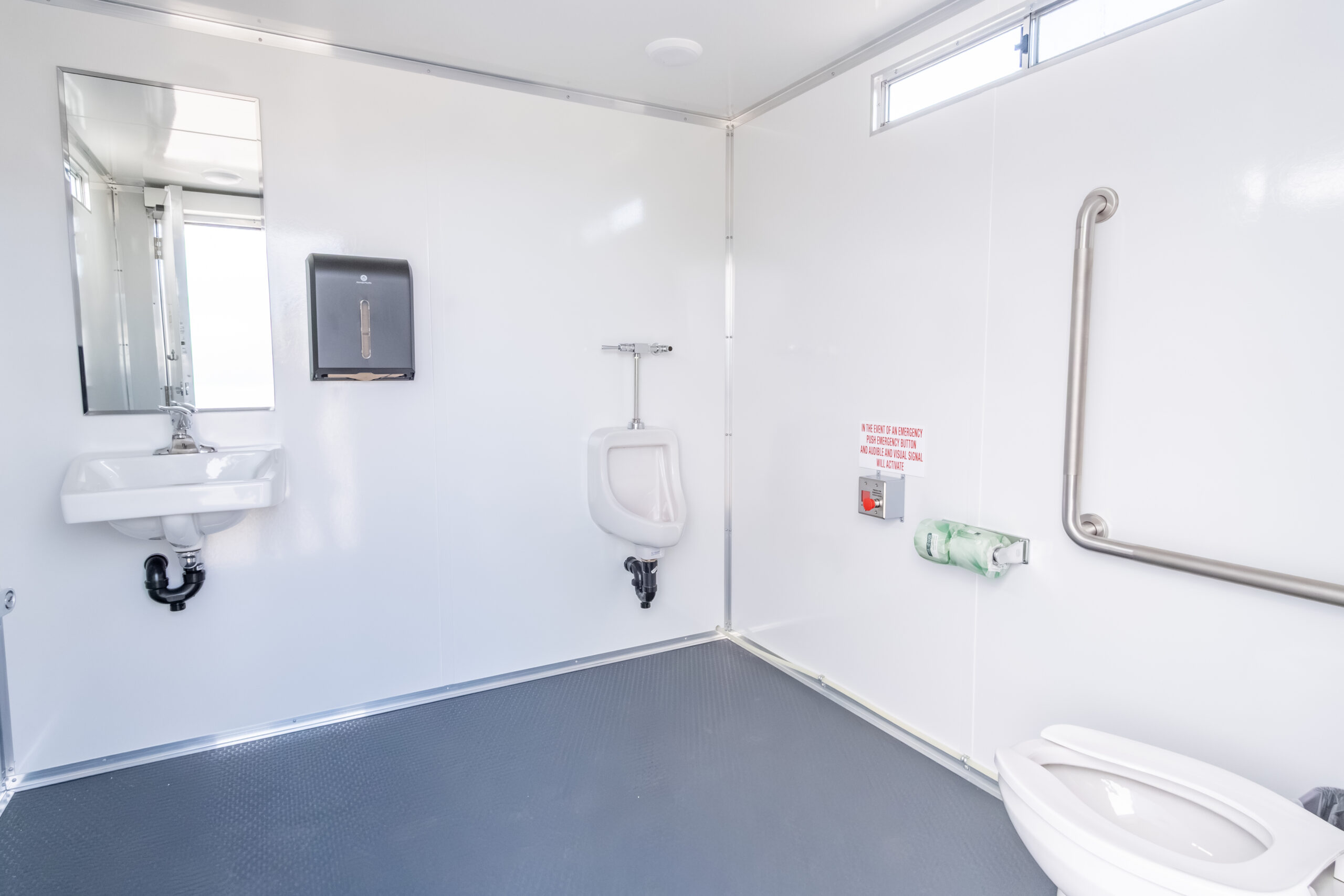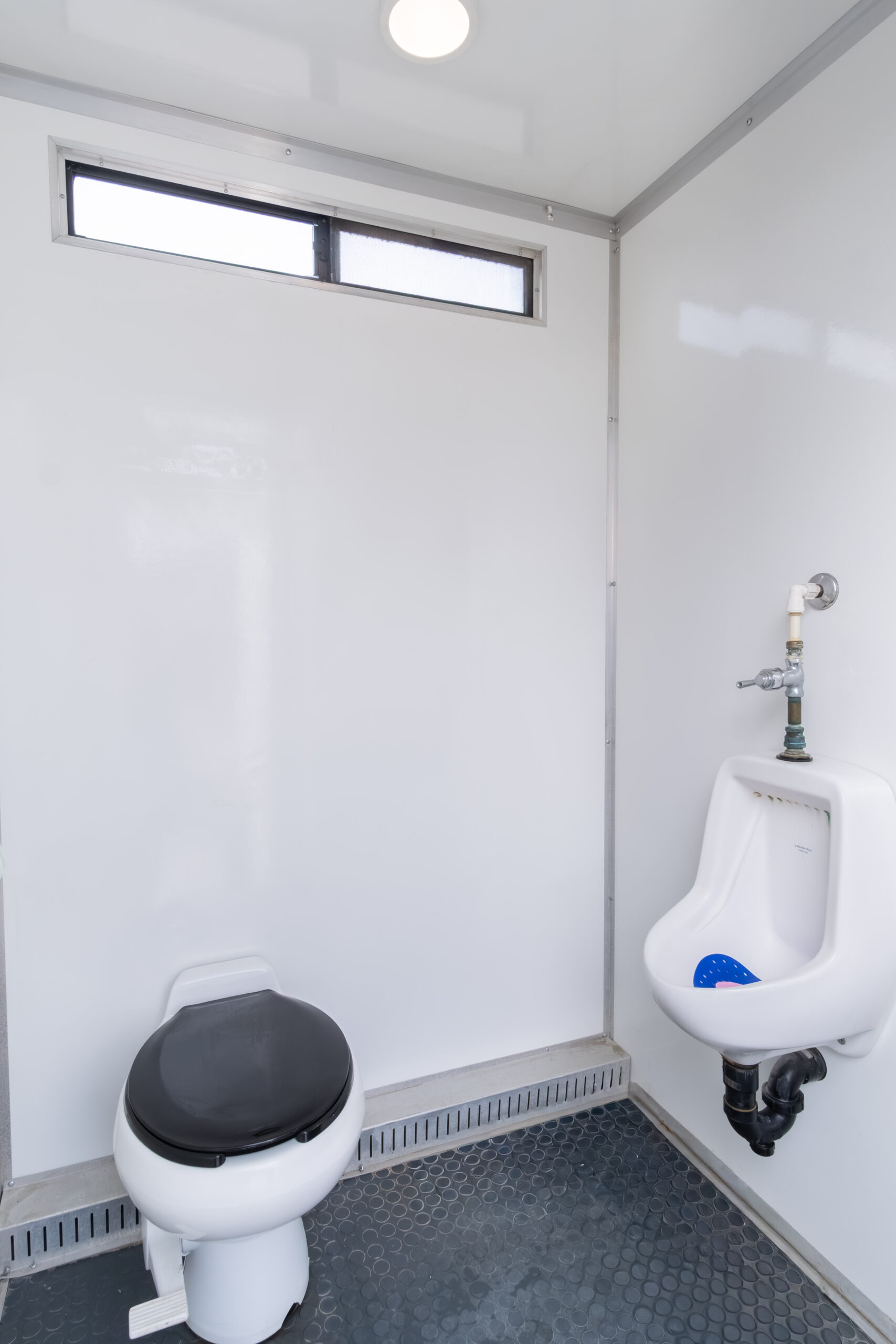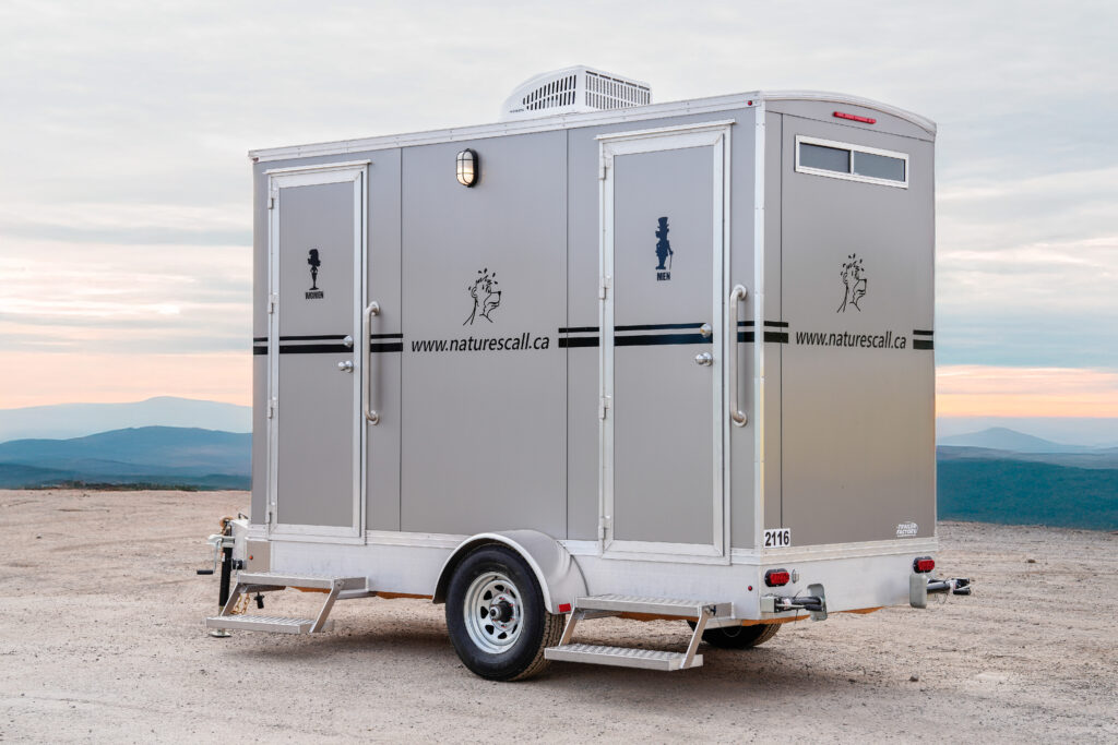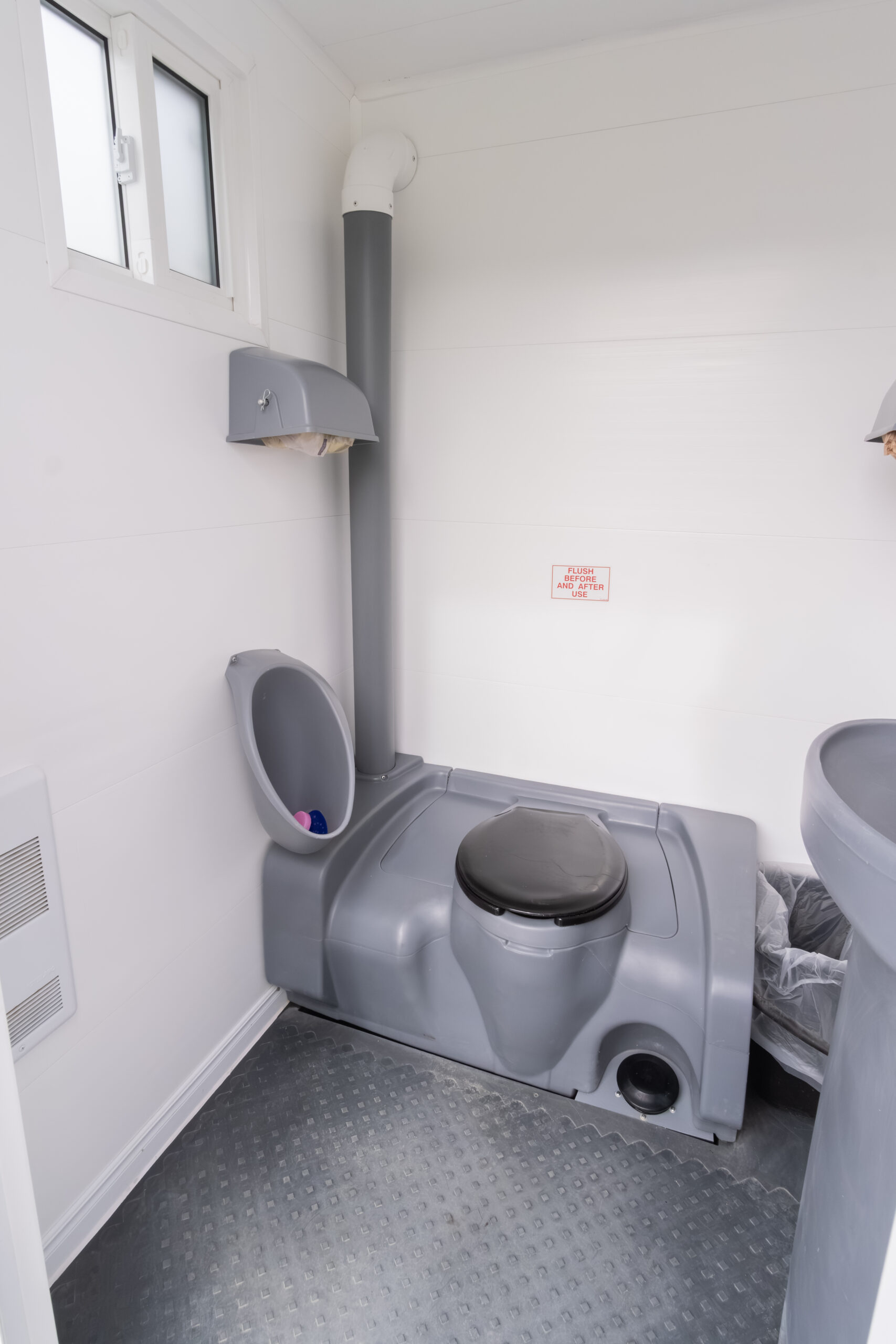Compact trailer unit that provides on-site restroom capacity in a smaller footprint. Includes air conditioning.