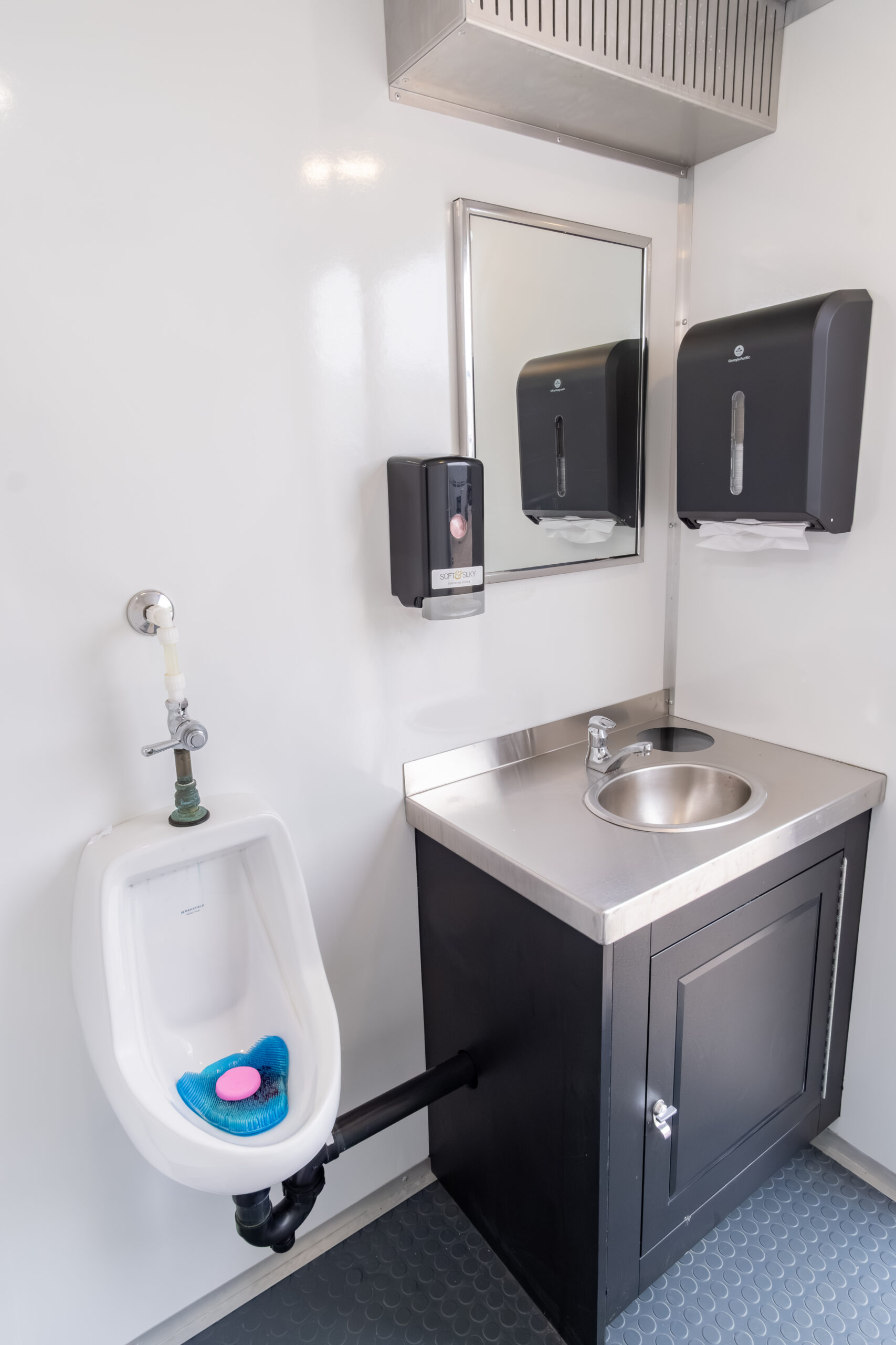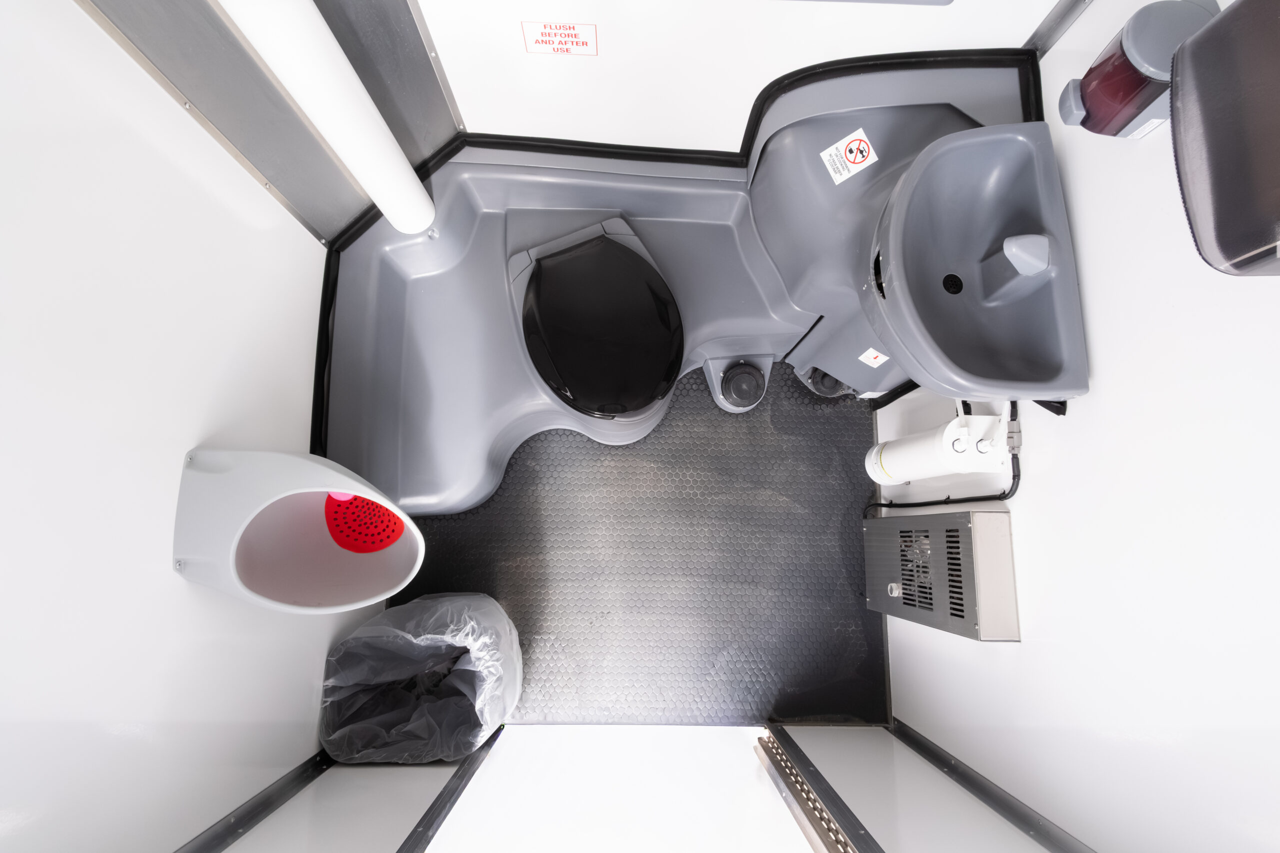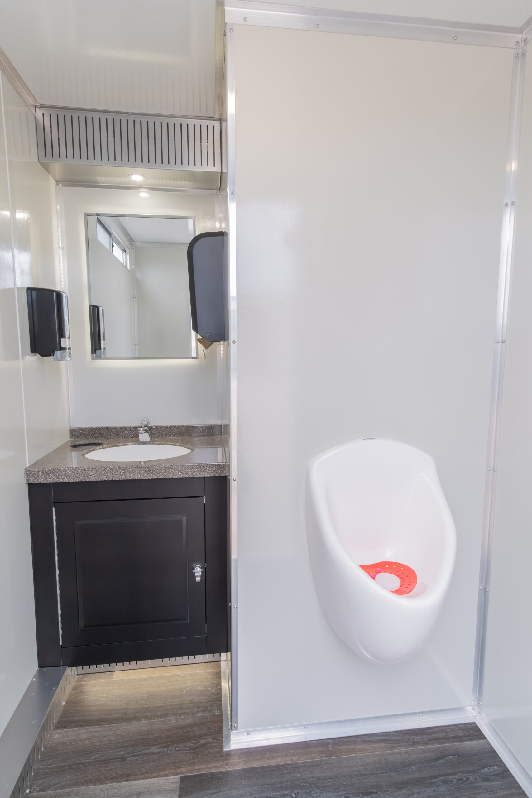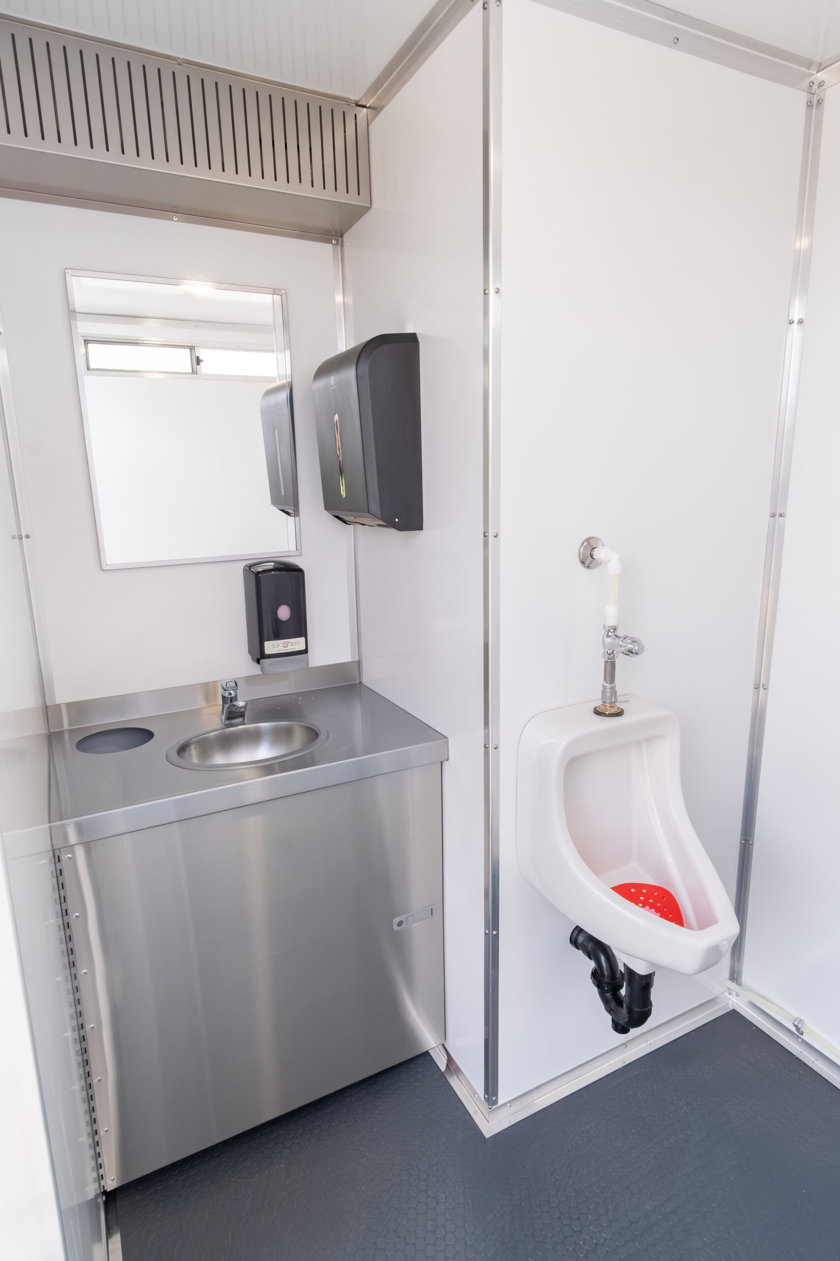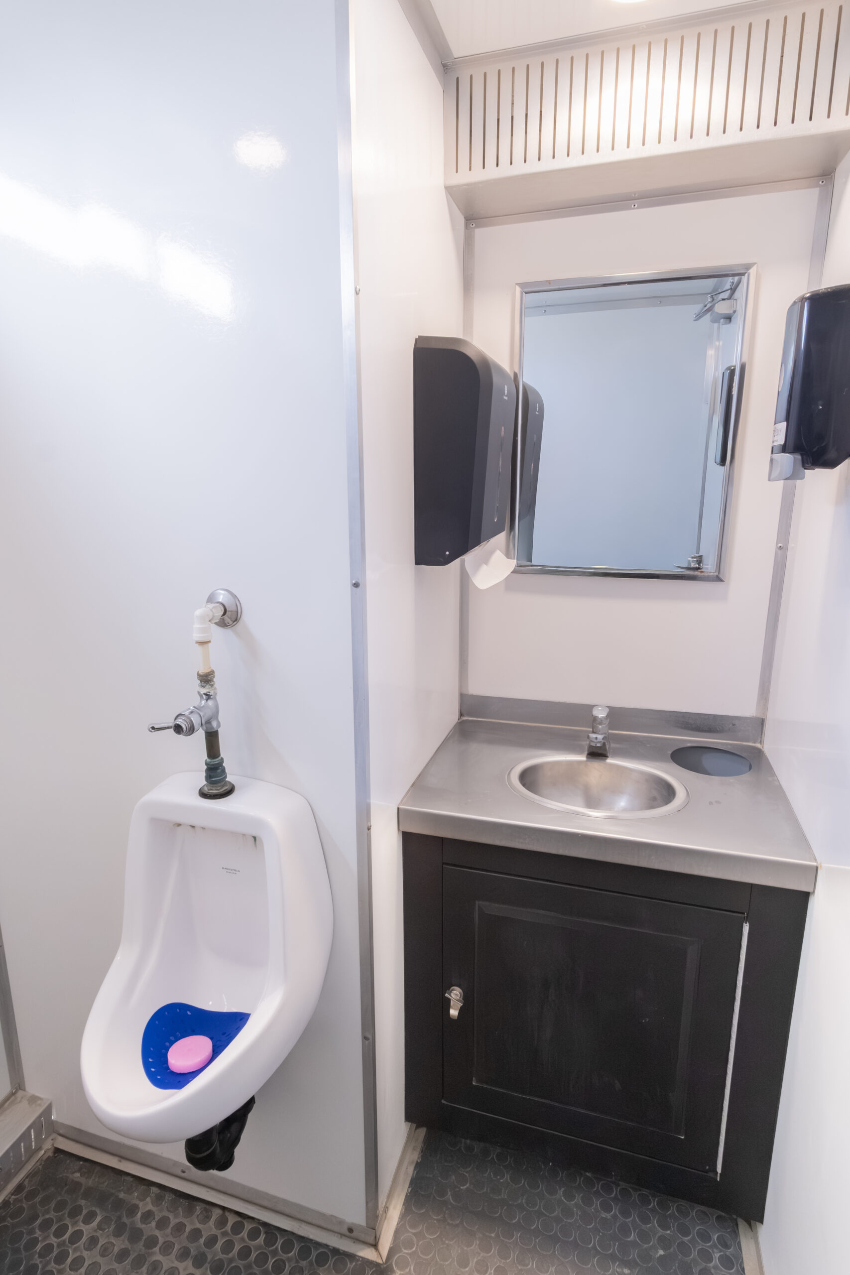 Compact trailer unit that provides on-site restroom capacity in a smaller footprint. Includes air conditioning.