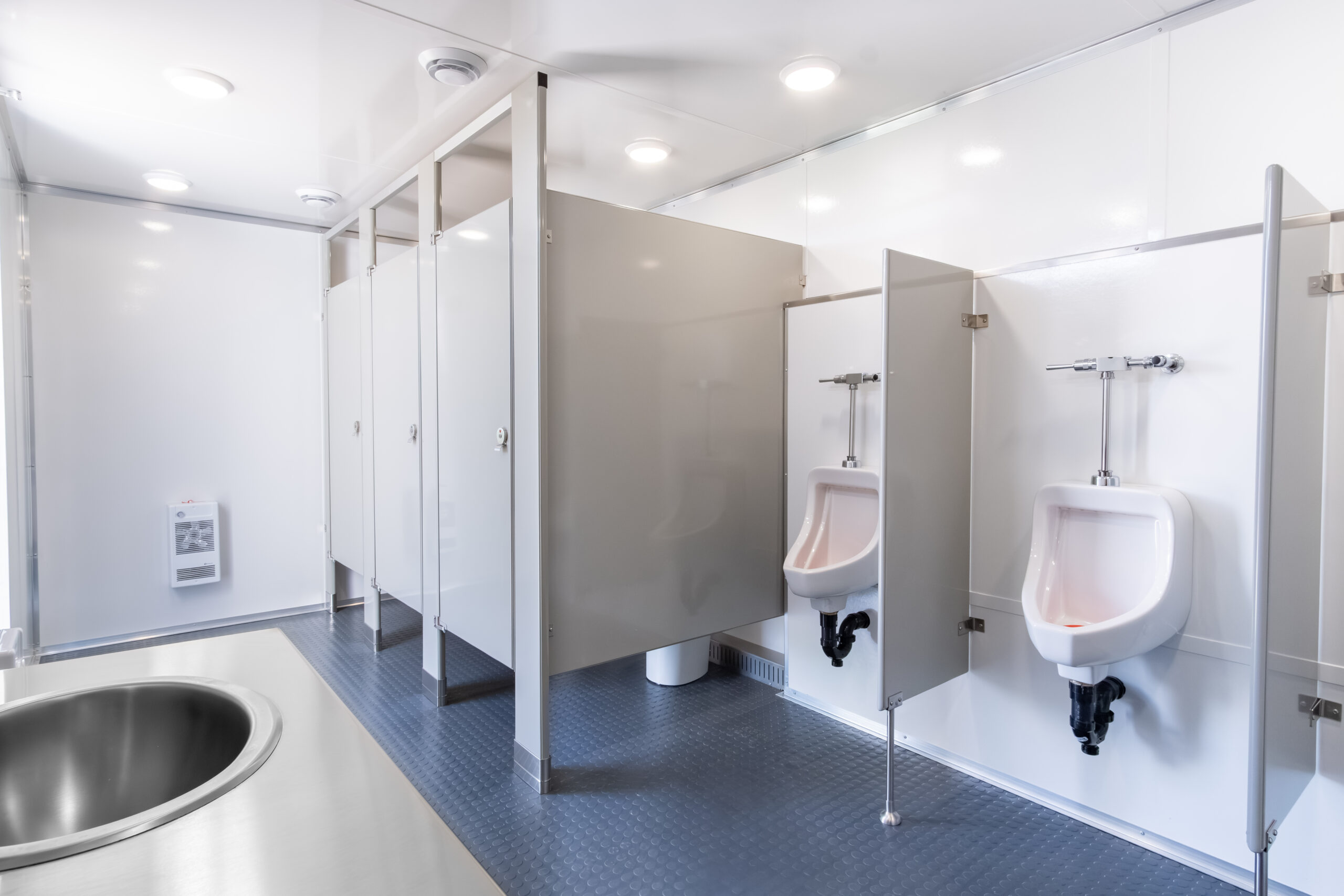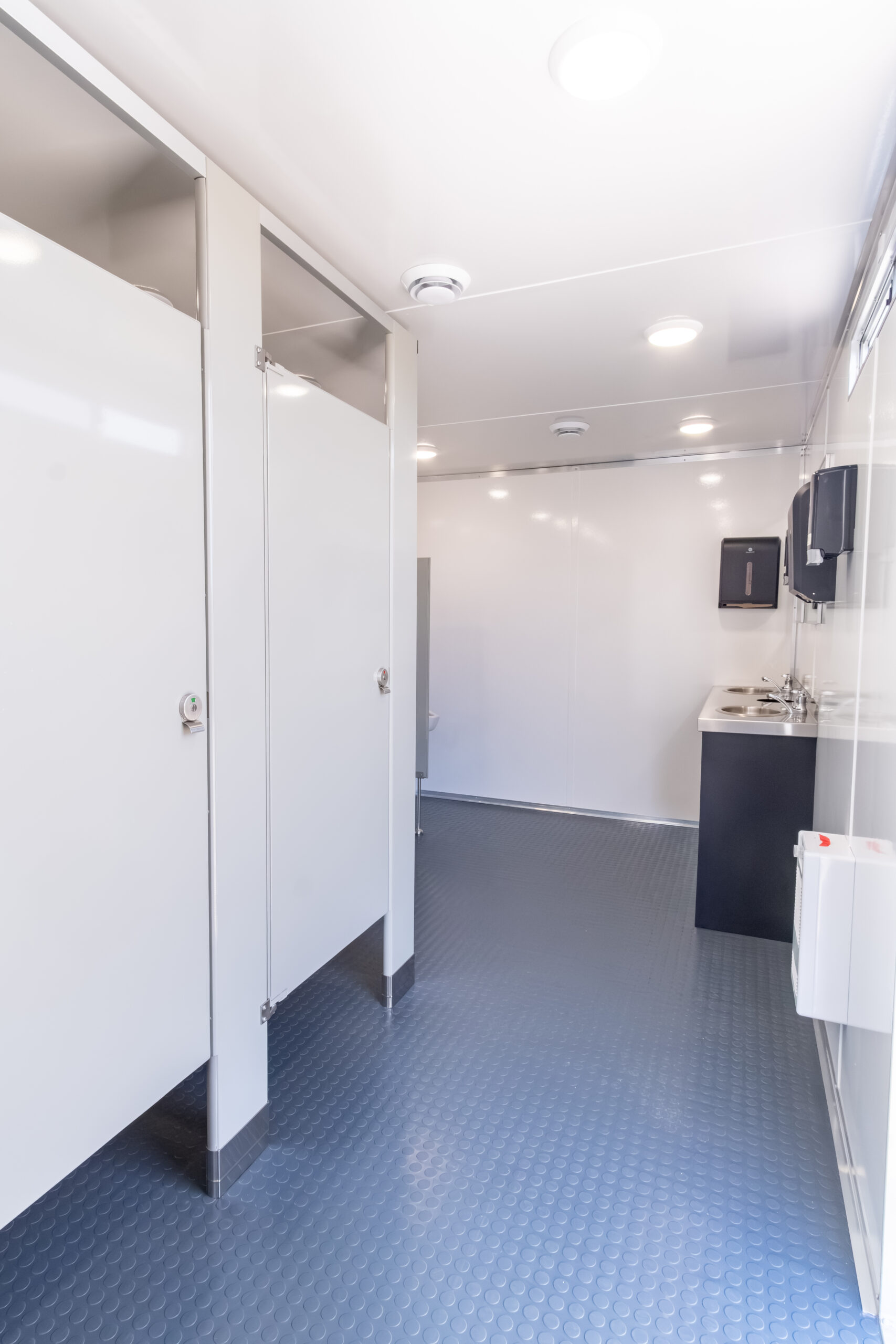 The heavy duty industrial construction makes the Four Washroom Trailer the ideal washroom facility for any industrial or job site. Our Four Washroom Trailer is constructed from strong, sturdy components and provides the ultimate in privacy for both female and male workers. It is the perfect choice for your construction site or mobile sales office washroom facility.