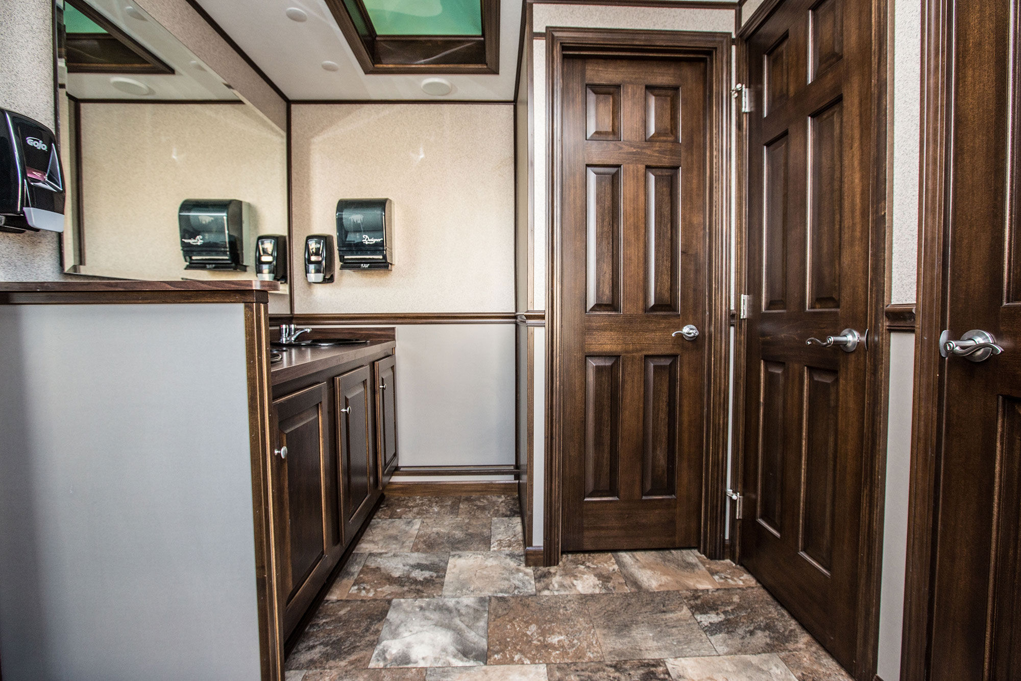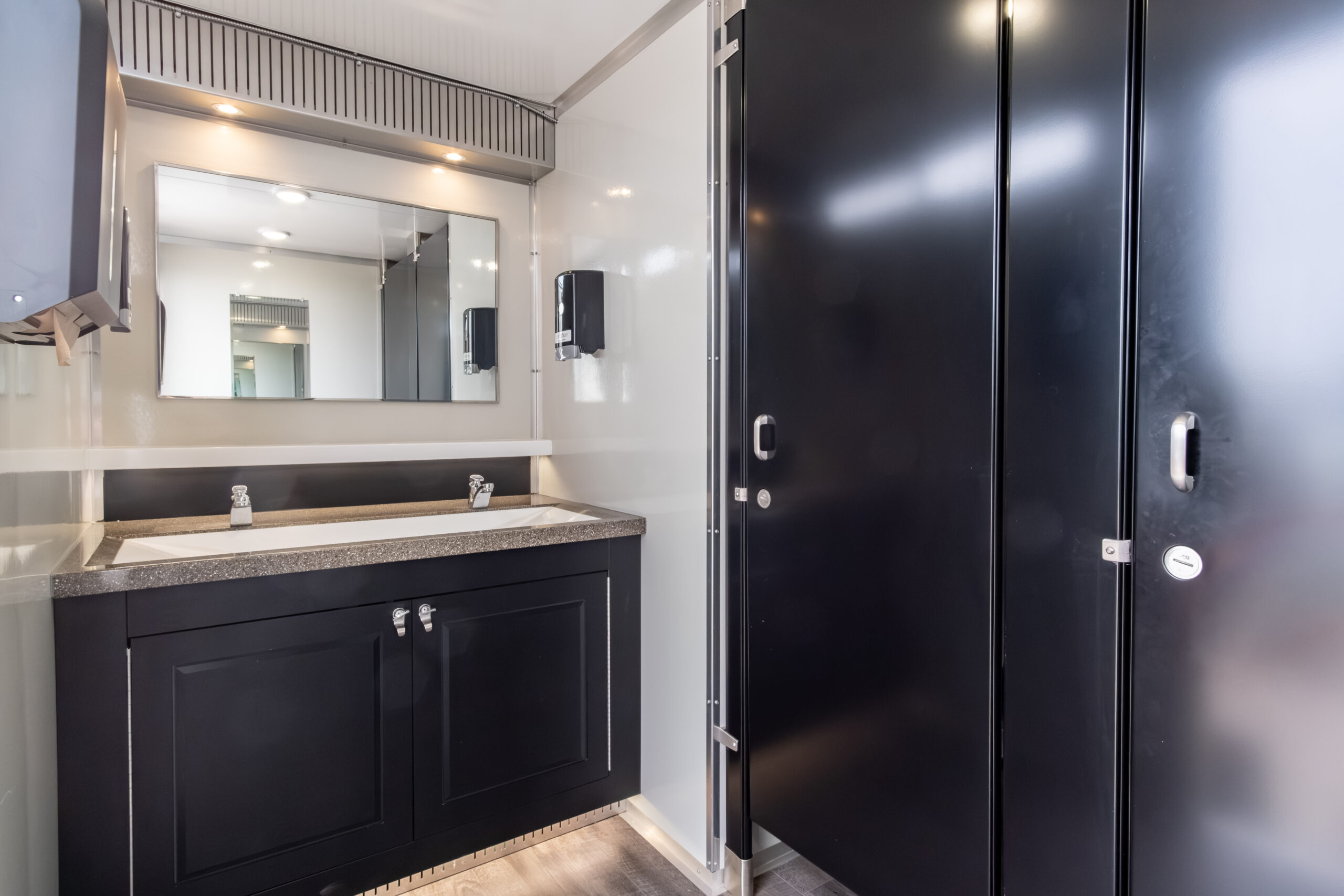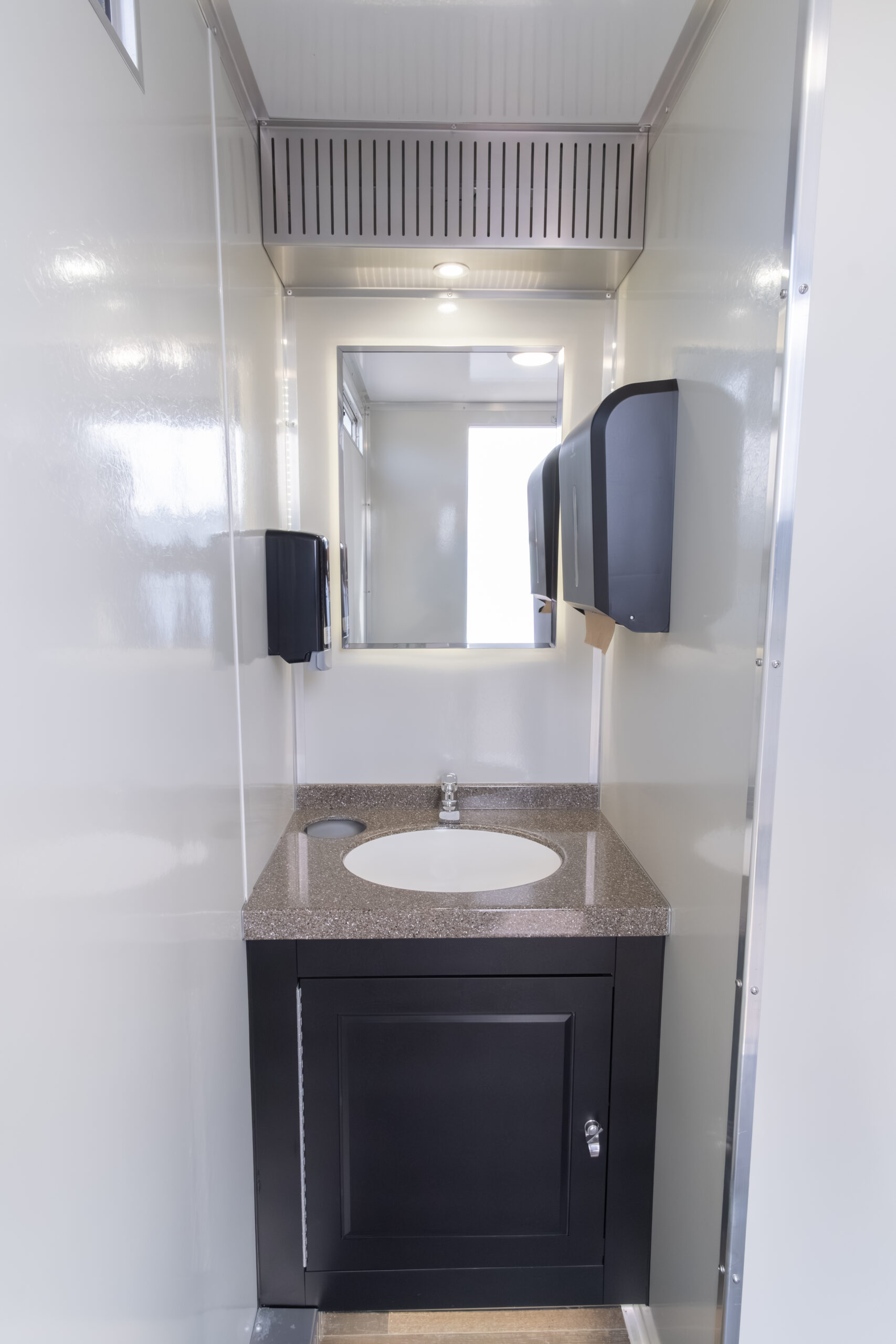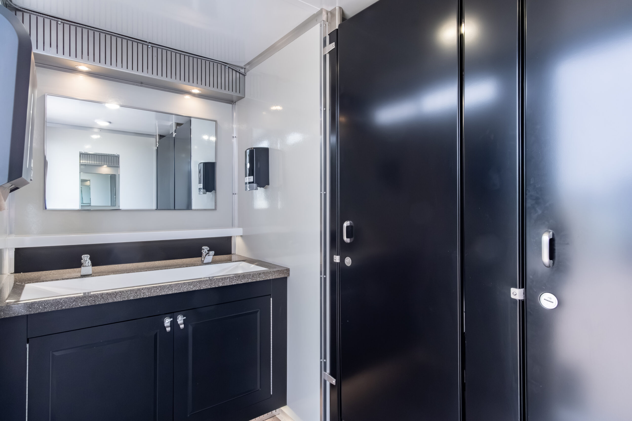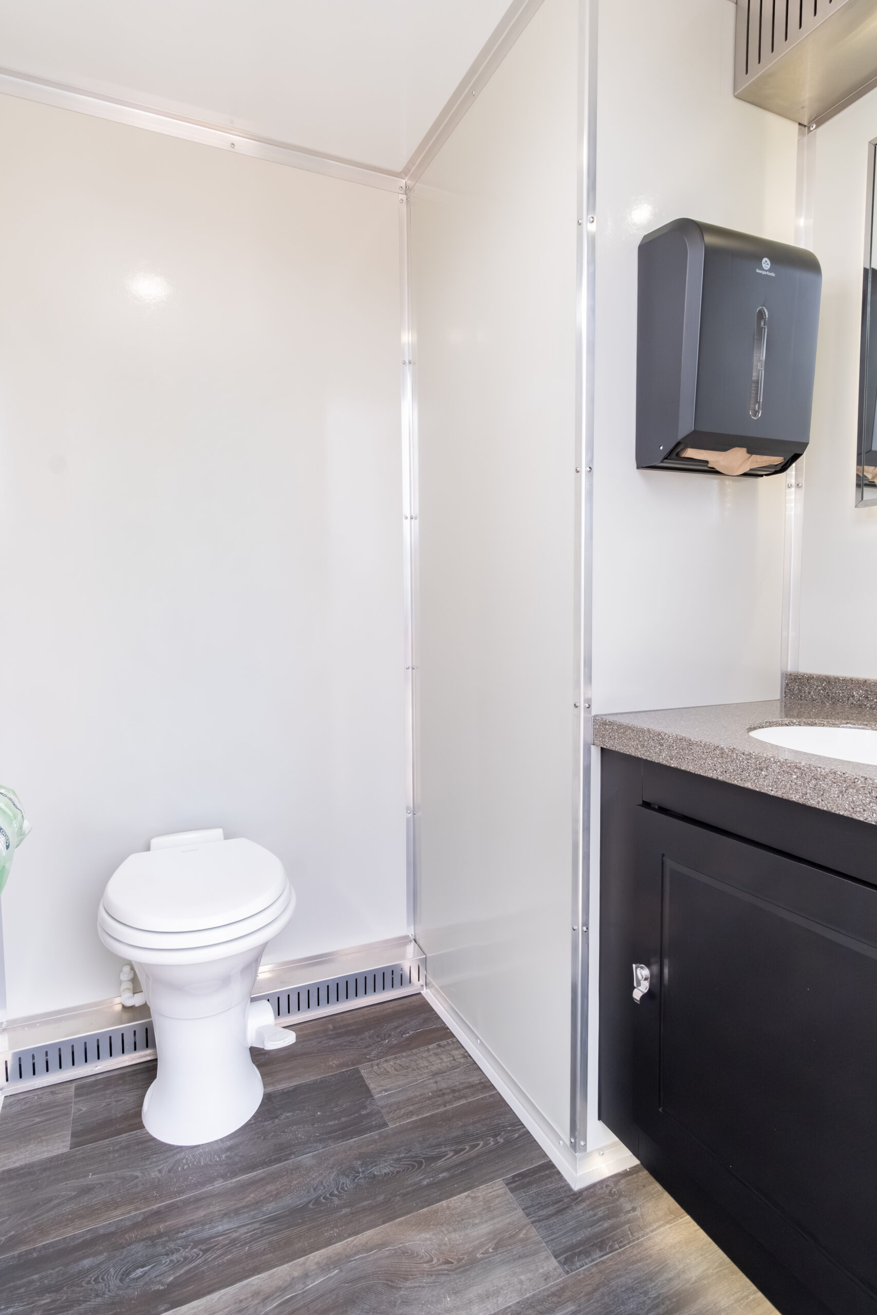Enjoy surprising comfort and luxury in our Elegance 300 Mobile Restroom Suite featuring elegant interior styling and advanced interior and exterior construction. This luxury washroom trailer is only one example of the Luxury restroom suites Nature’s Call has to offer.