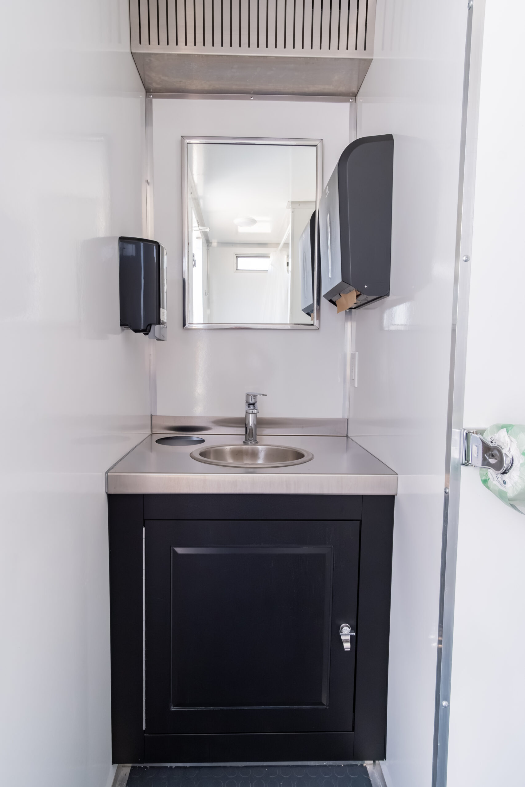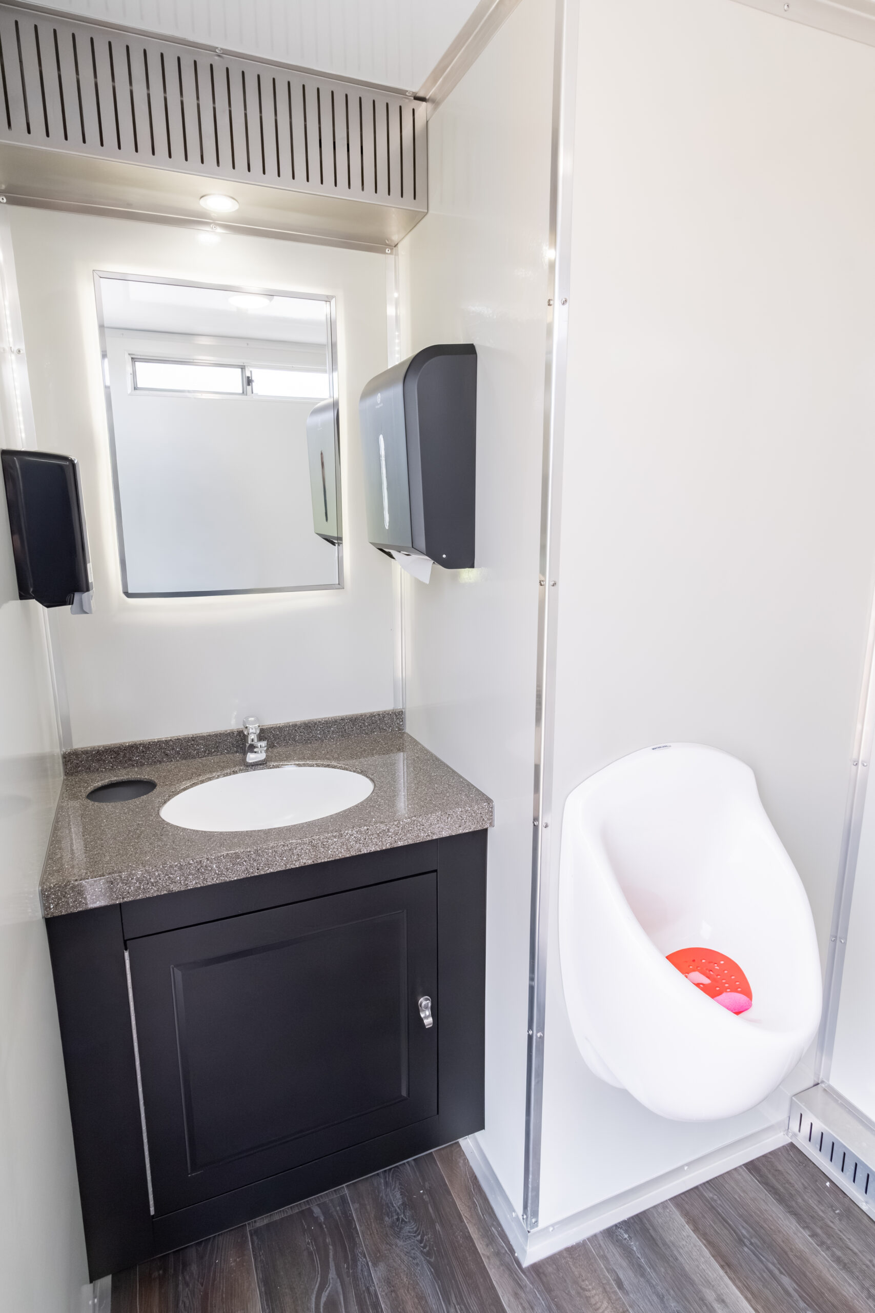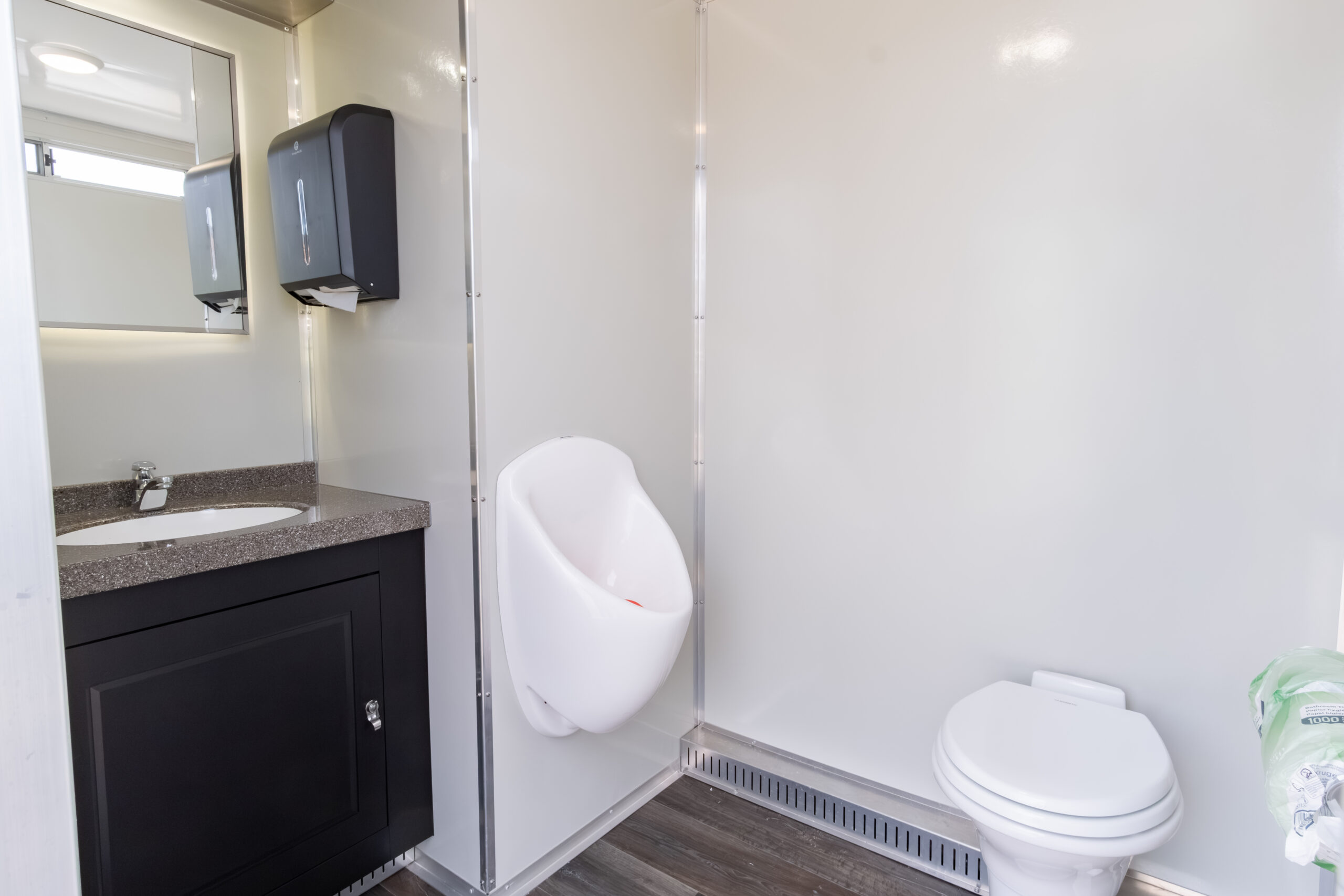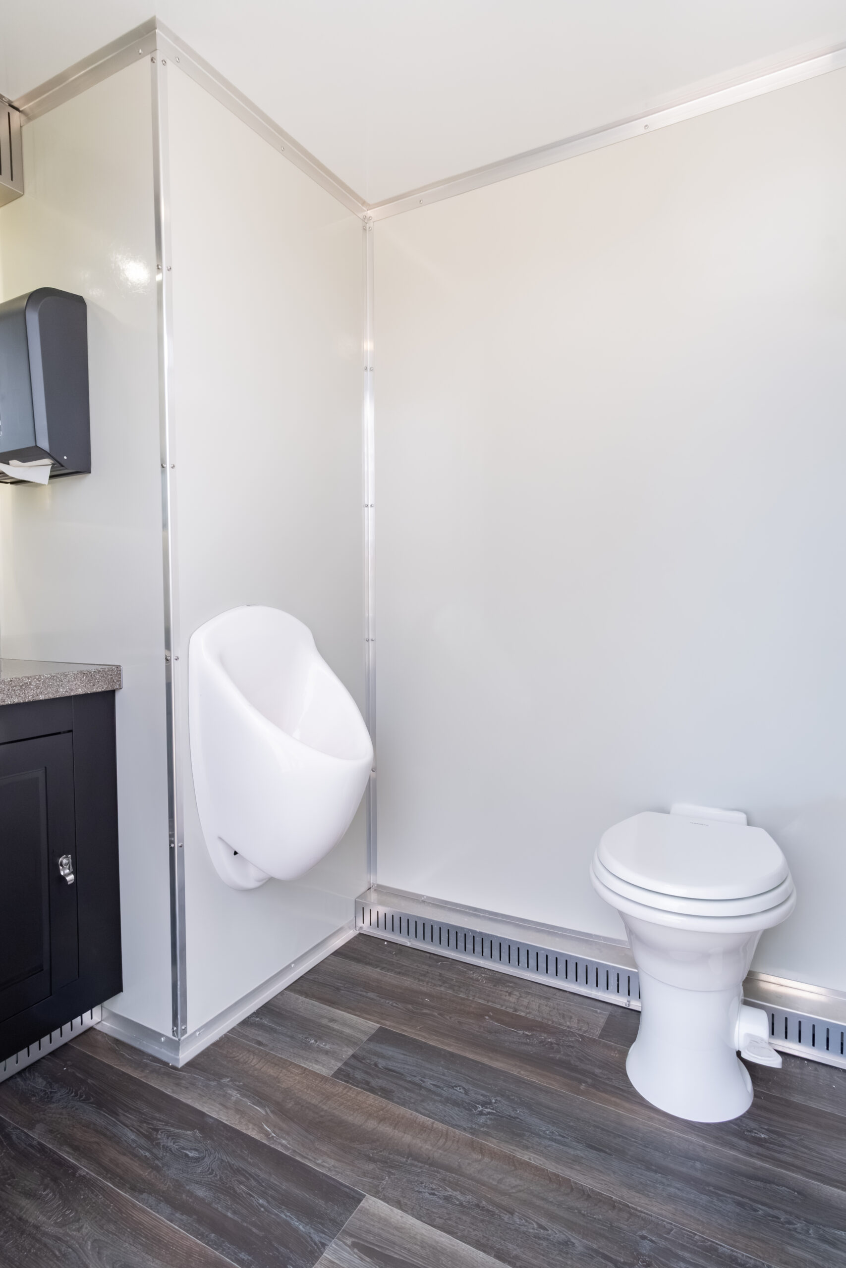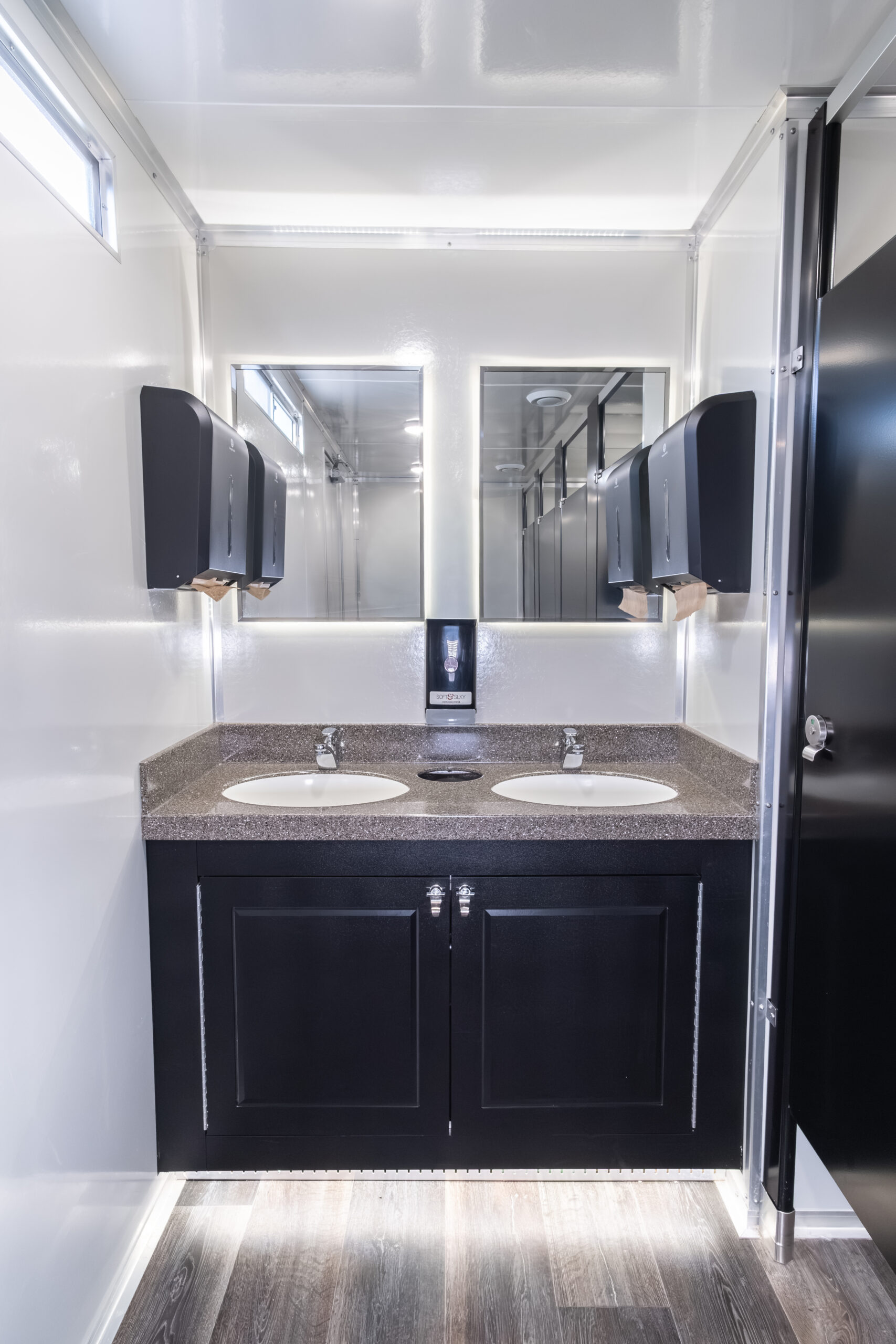 Enjoy surprising comfort and luxury in our Elegance 300 Mobile Restroom Suite featuring elegant interior styling and advanced interior and exterior construction. This luxury washroom trailer is only one example of the Luxury restroom suites Nature’s Call has to offer.